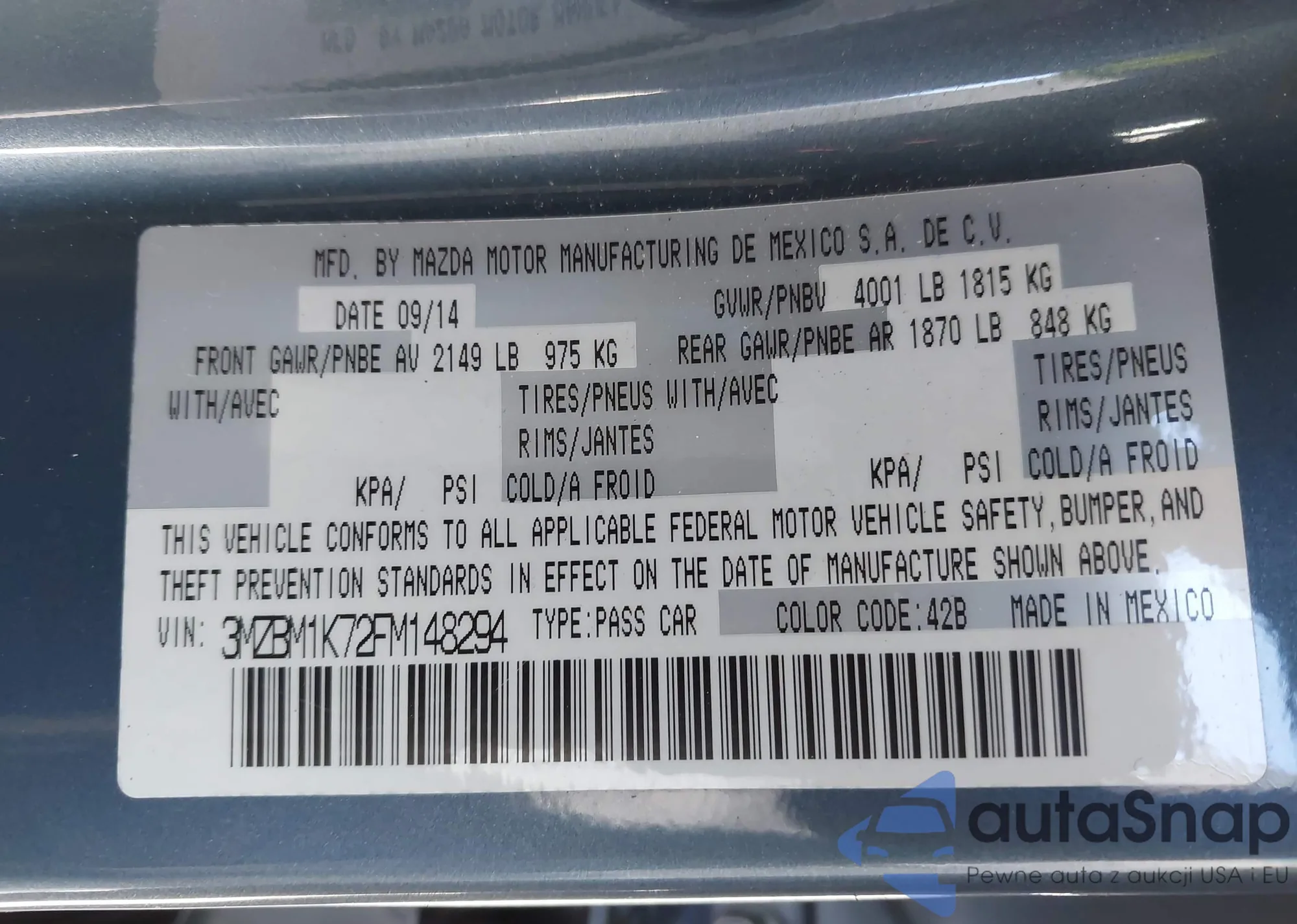 LOT: 41629429 VIN: 3MZBM1K72FM148294
