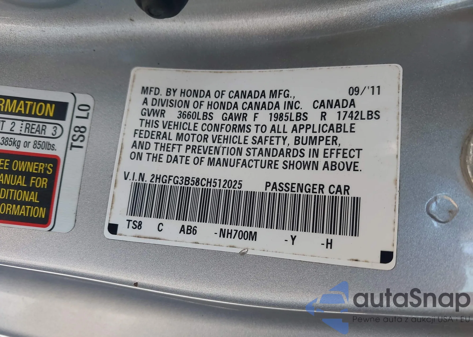• VIN 2HGFG3B58CH512025