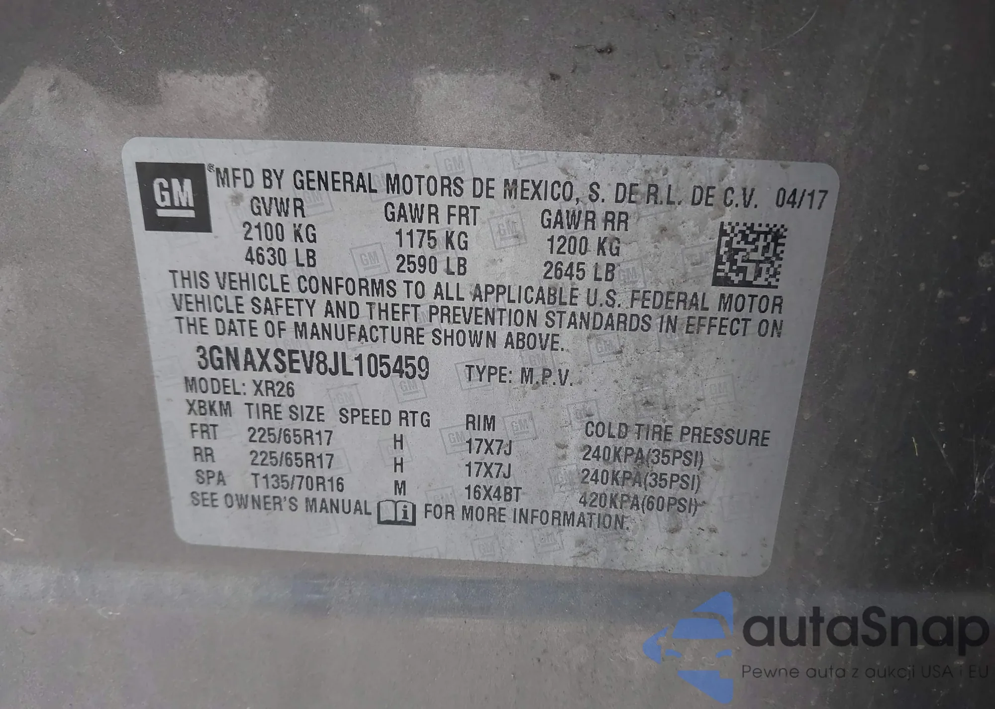LOT: 42519715 VIN: 3GNAXSEV8JL105459