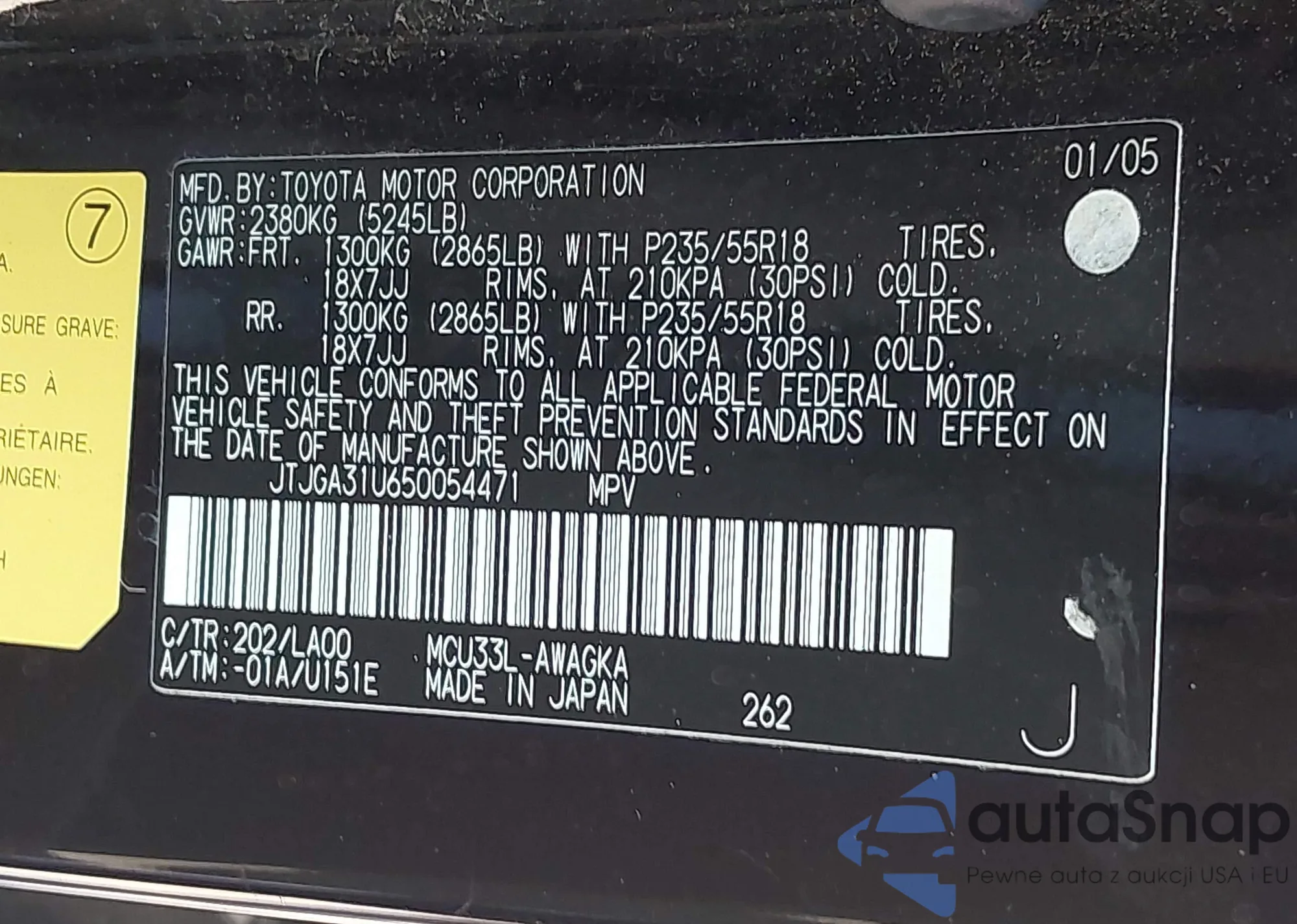 LOT: 42804899 VIN: JTJGA31U650054471