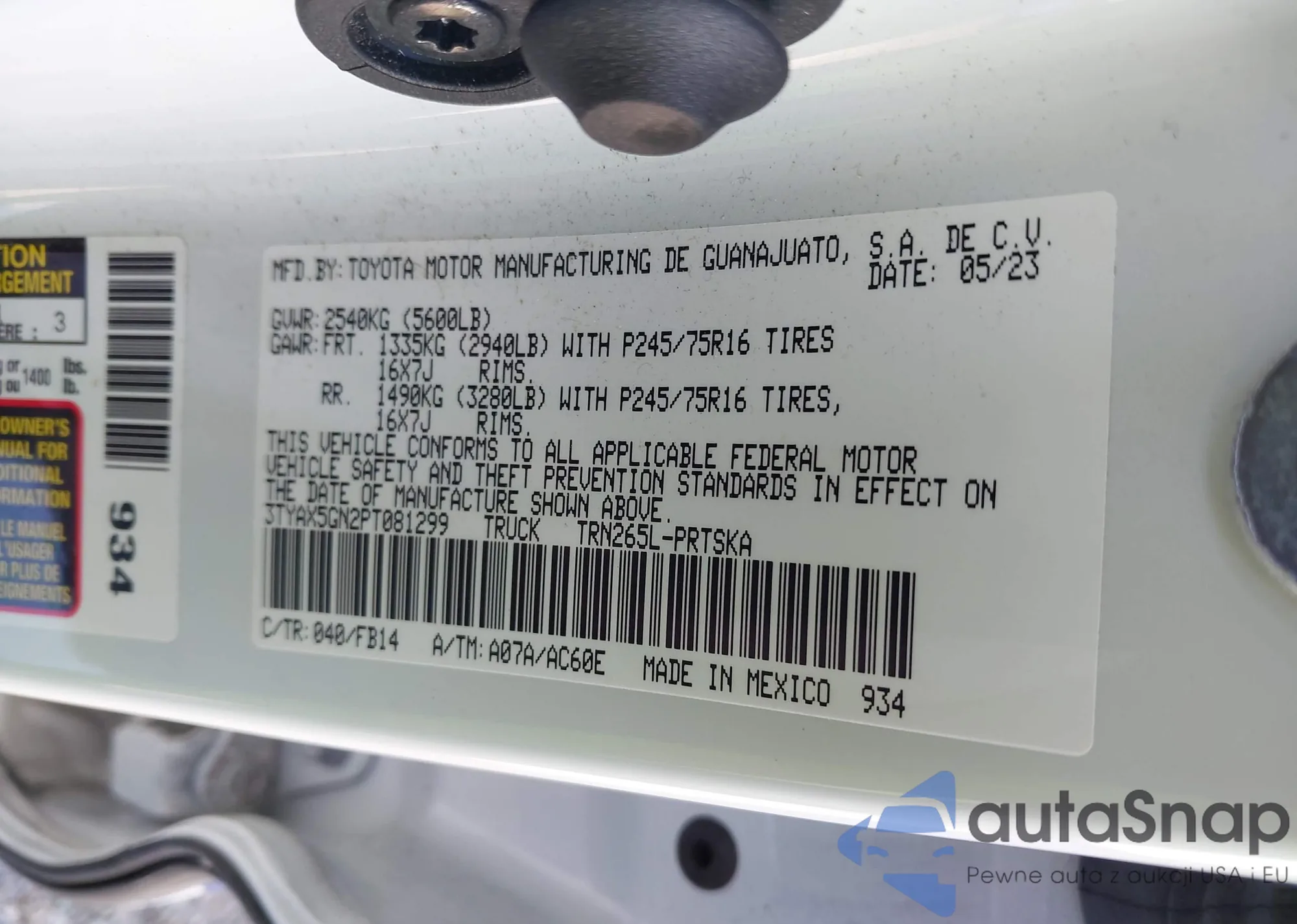 • VIN 3TYAX5GN2PT081299