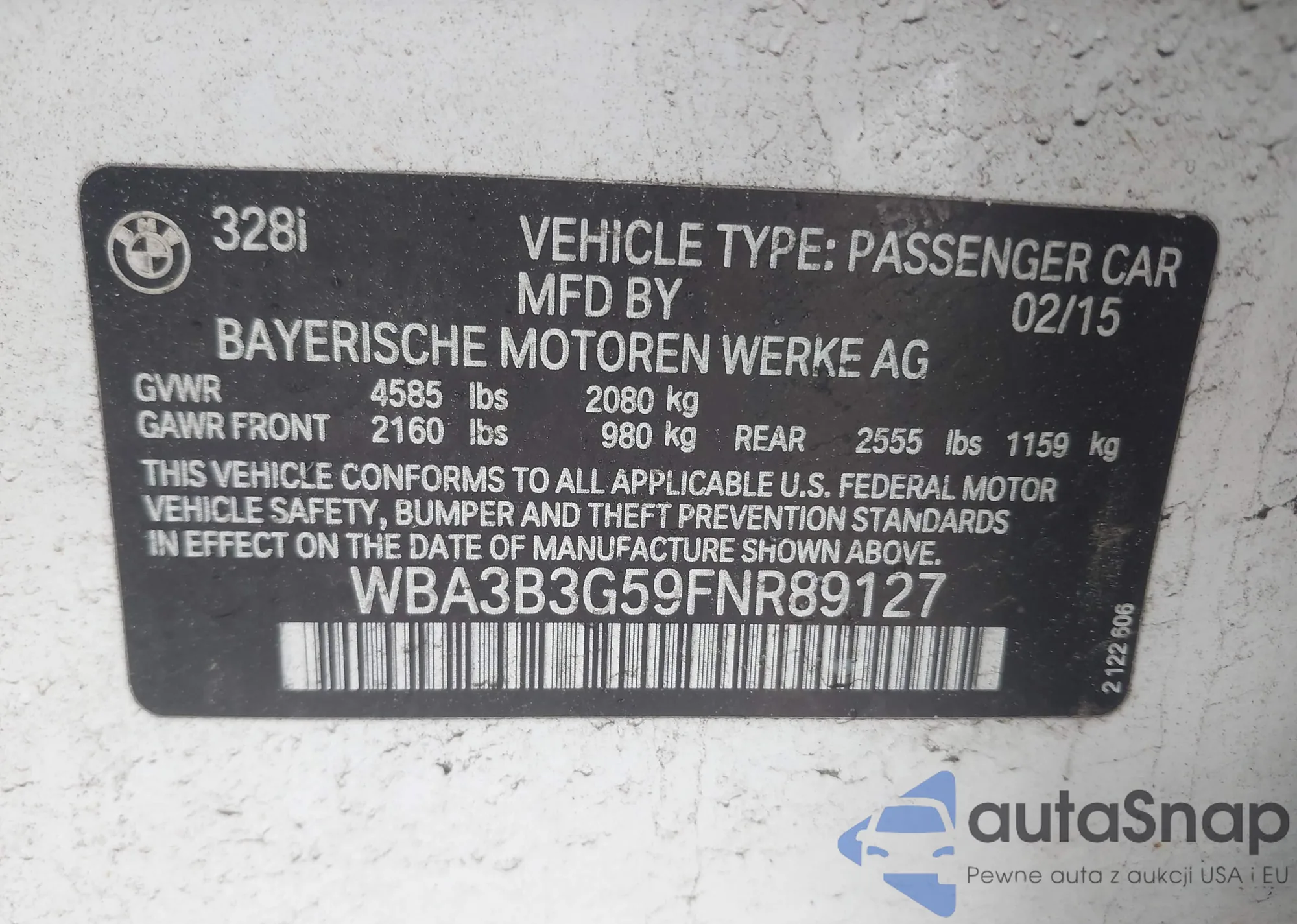 2015 BMW 328 Xi из США, поврежденный, VIN WBA3B3G59FNR89127