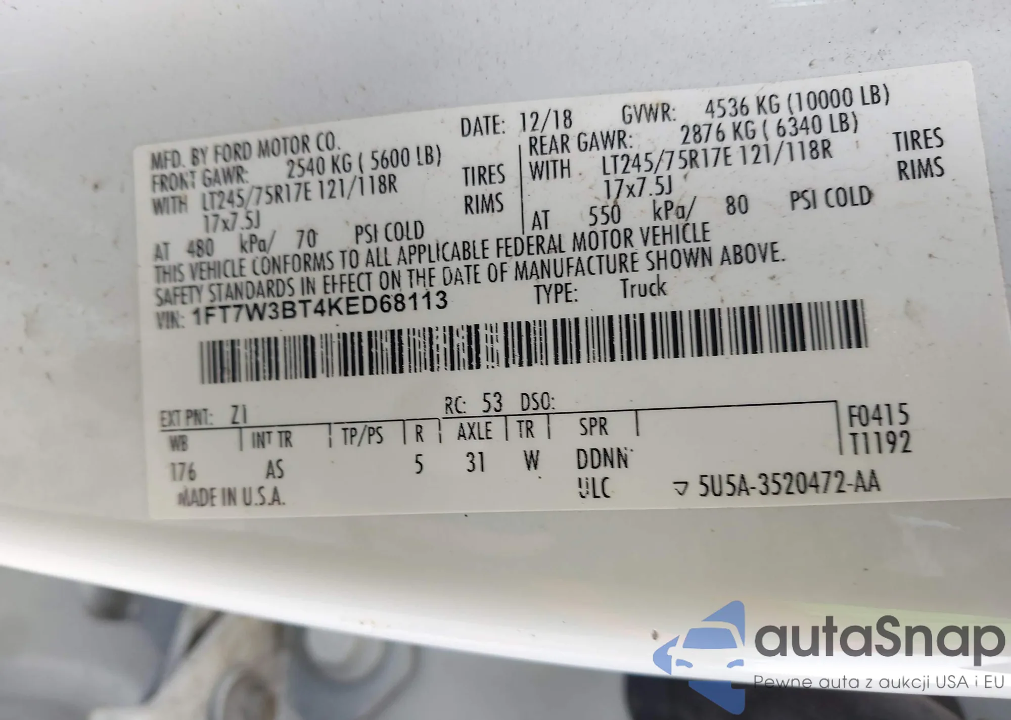 • VIN 1FT7W3BT4KED68113