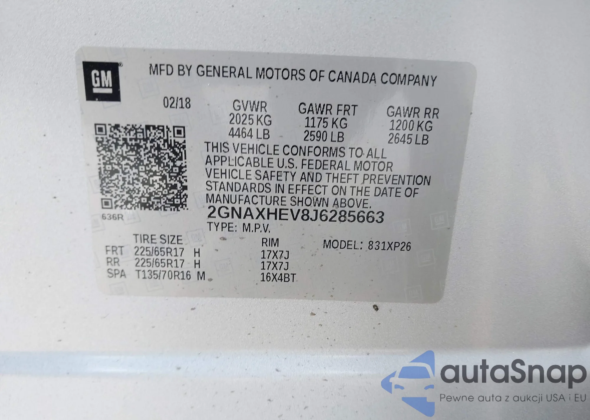 LOT: 42653389 VIN: 2GNAXHEV8J6285663