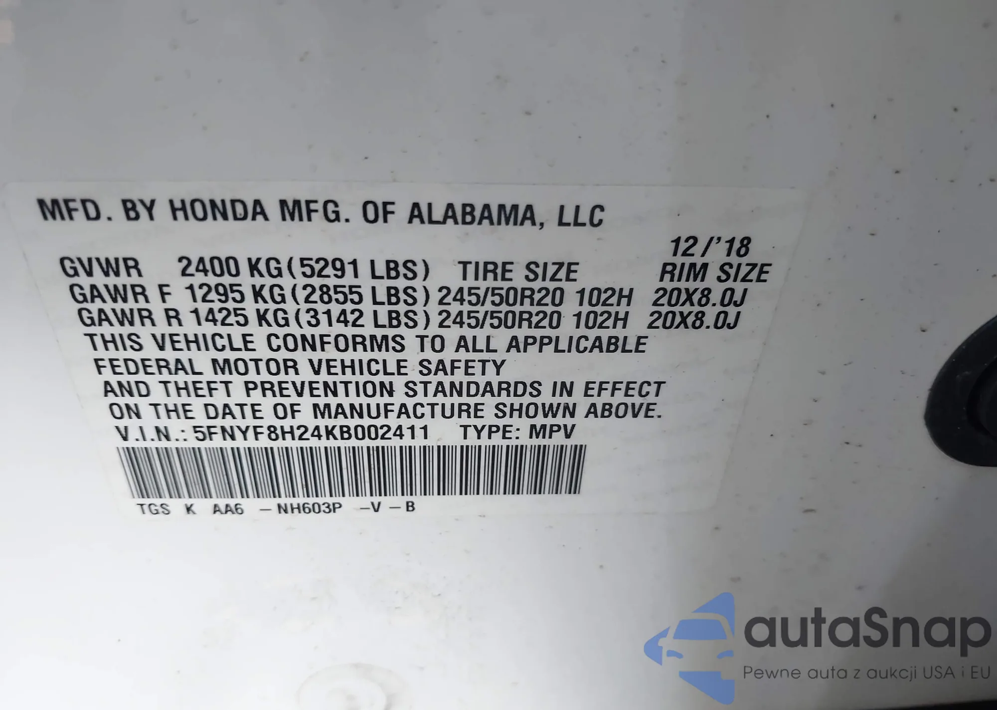 LOT: 42567249 VIN: 5FNYF8H24KB002411