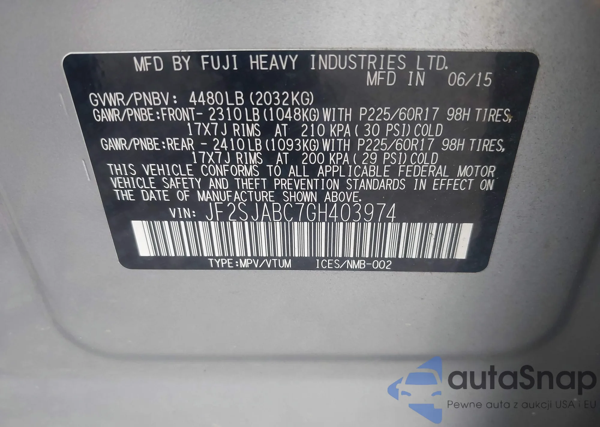 LOT: 42639642 VIN: 5J6TF2H54AL000875