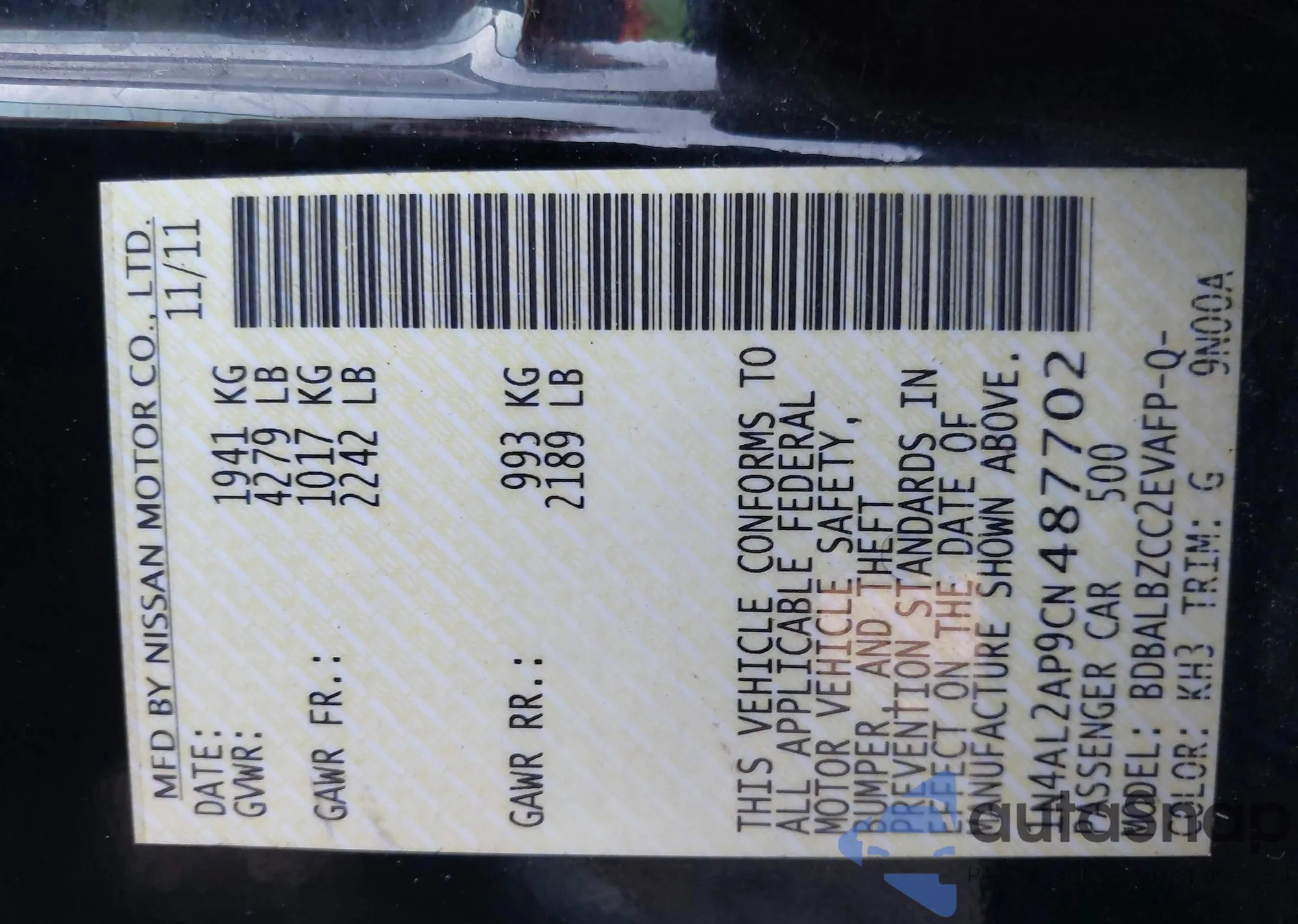 • VIN 1N4AL2AP9CN487702