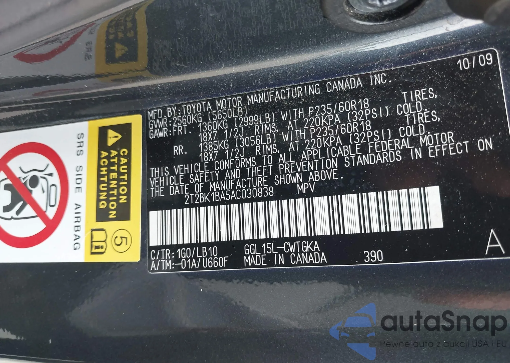 • VIN 2T2BK1BA5AC030838