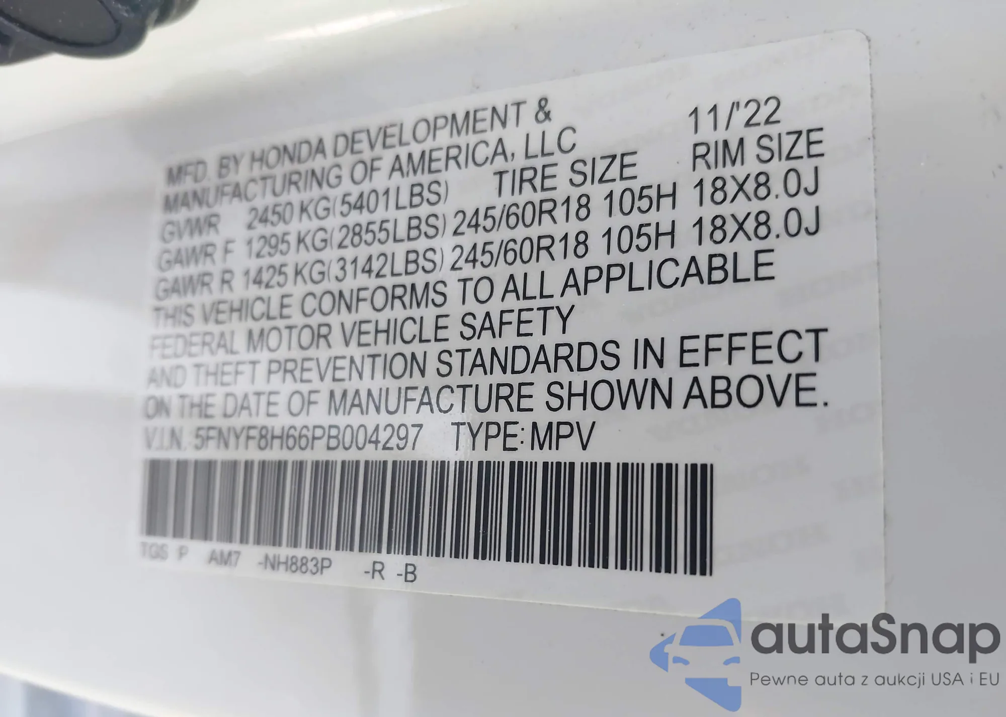 • VIN 5FNYF8H66PB004297