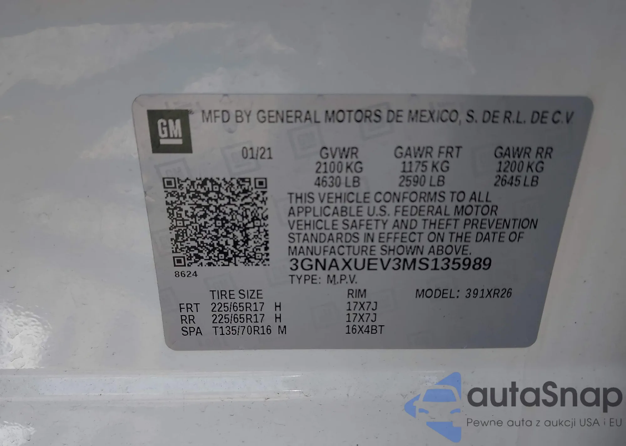 LOT: 42423026 VIN: 3GNAXUEV3MS135989