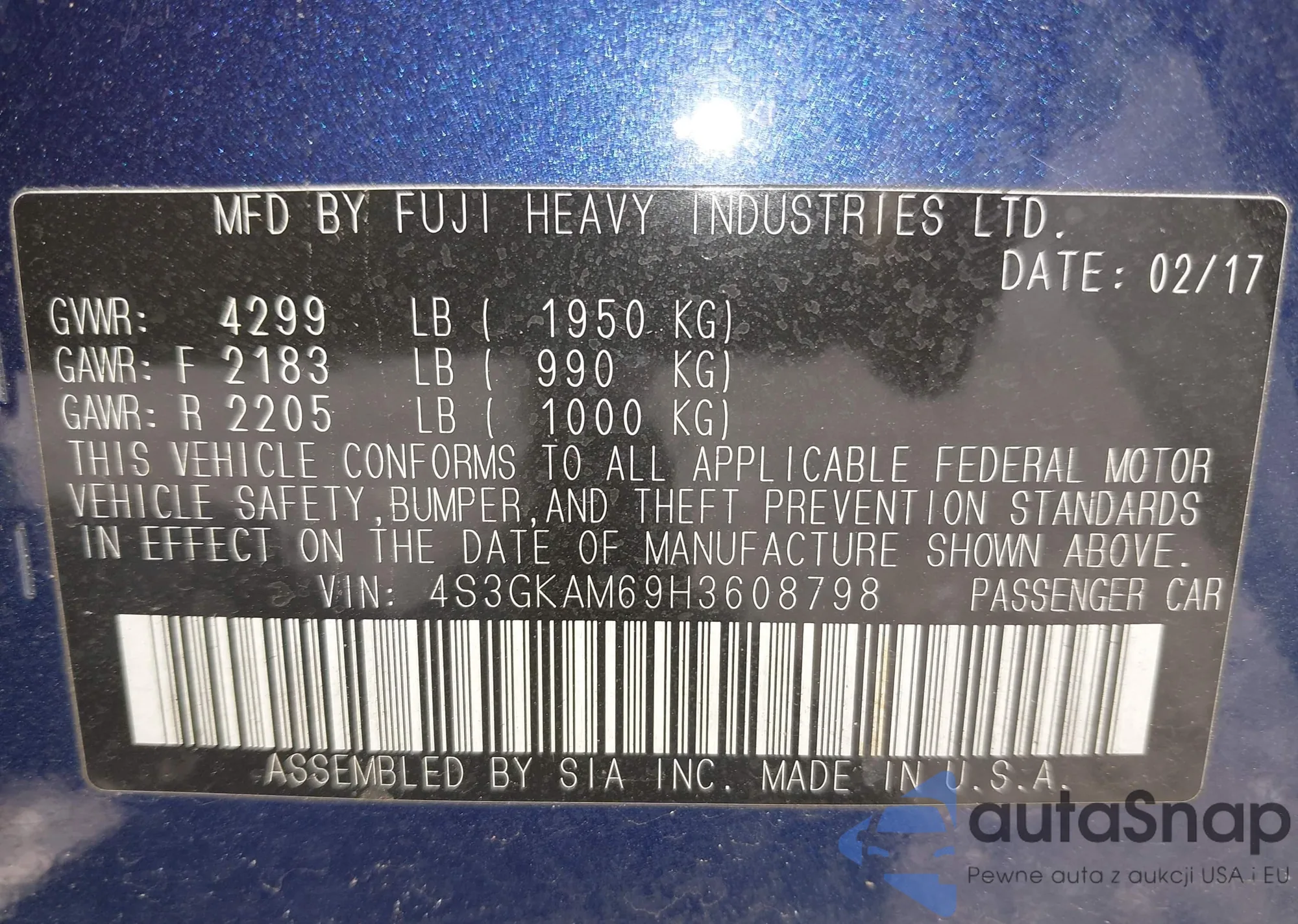 • VIN 4S3GKAM69H3608798