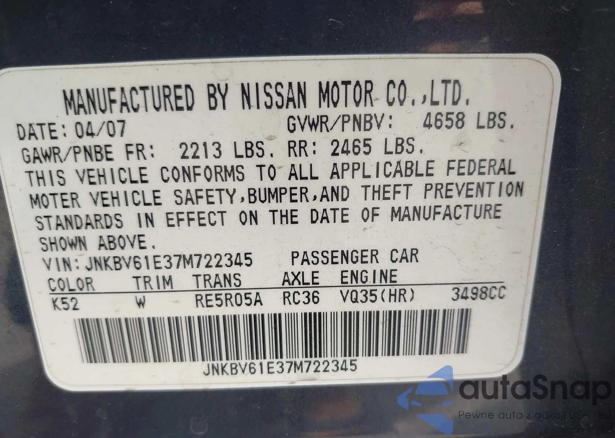 LOT: 42789089 VIN: JNKBV61E37M722345