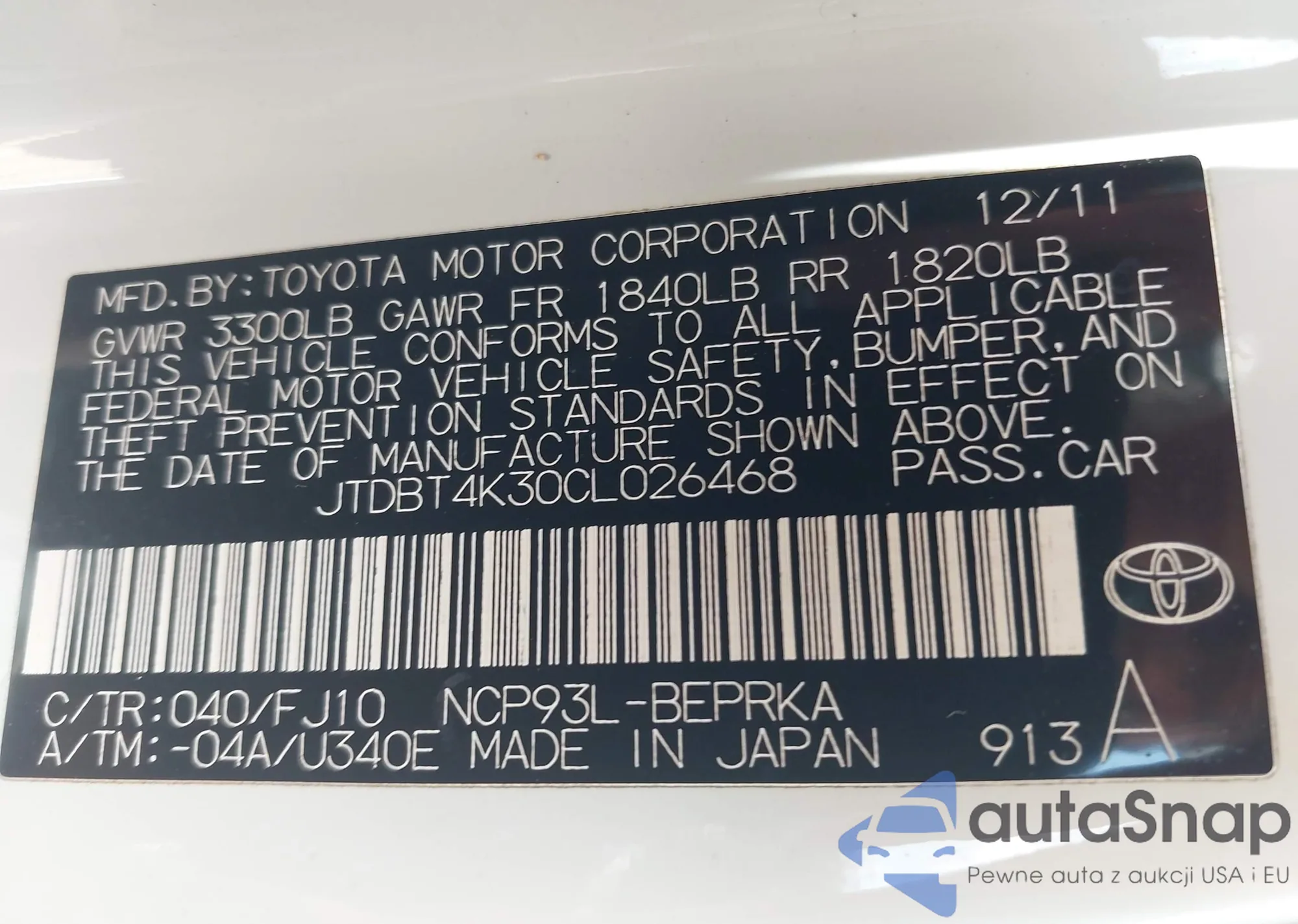 LOT: 42513731 VIN: JTDBT4K30CL026468