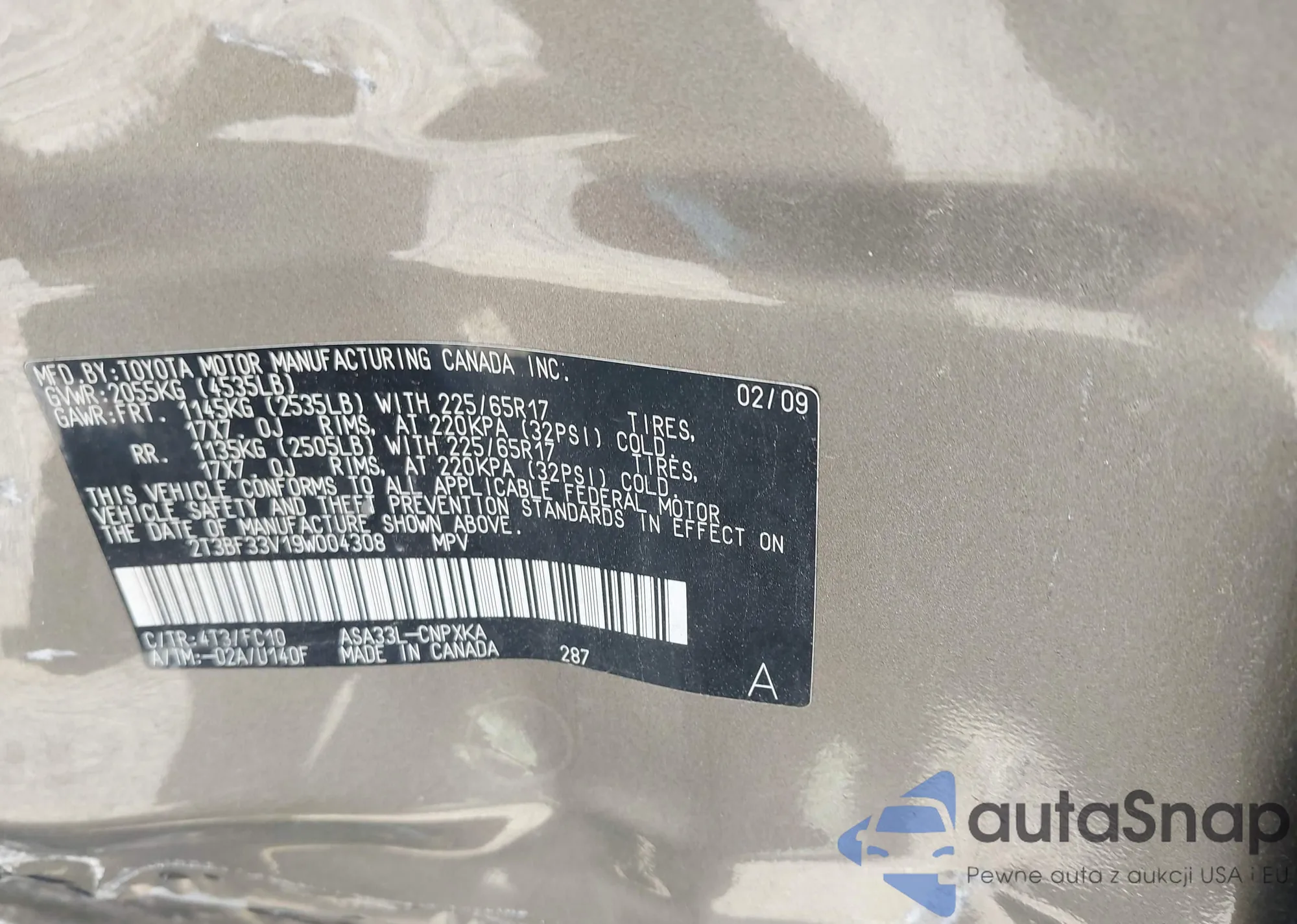 LOT: 42567440 VIN: 2T3BF33V19W004308