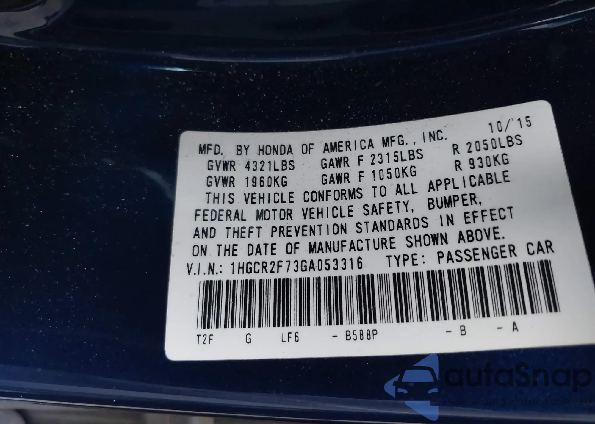 • VIN 1HGCR2F73GA053316