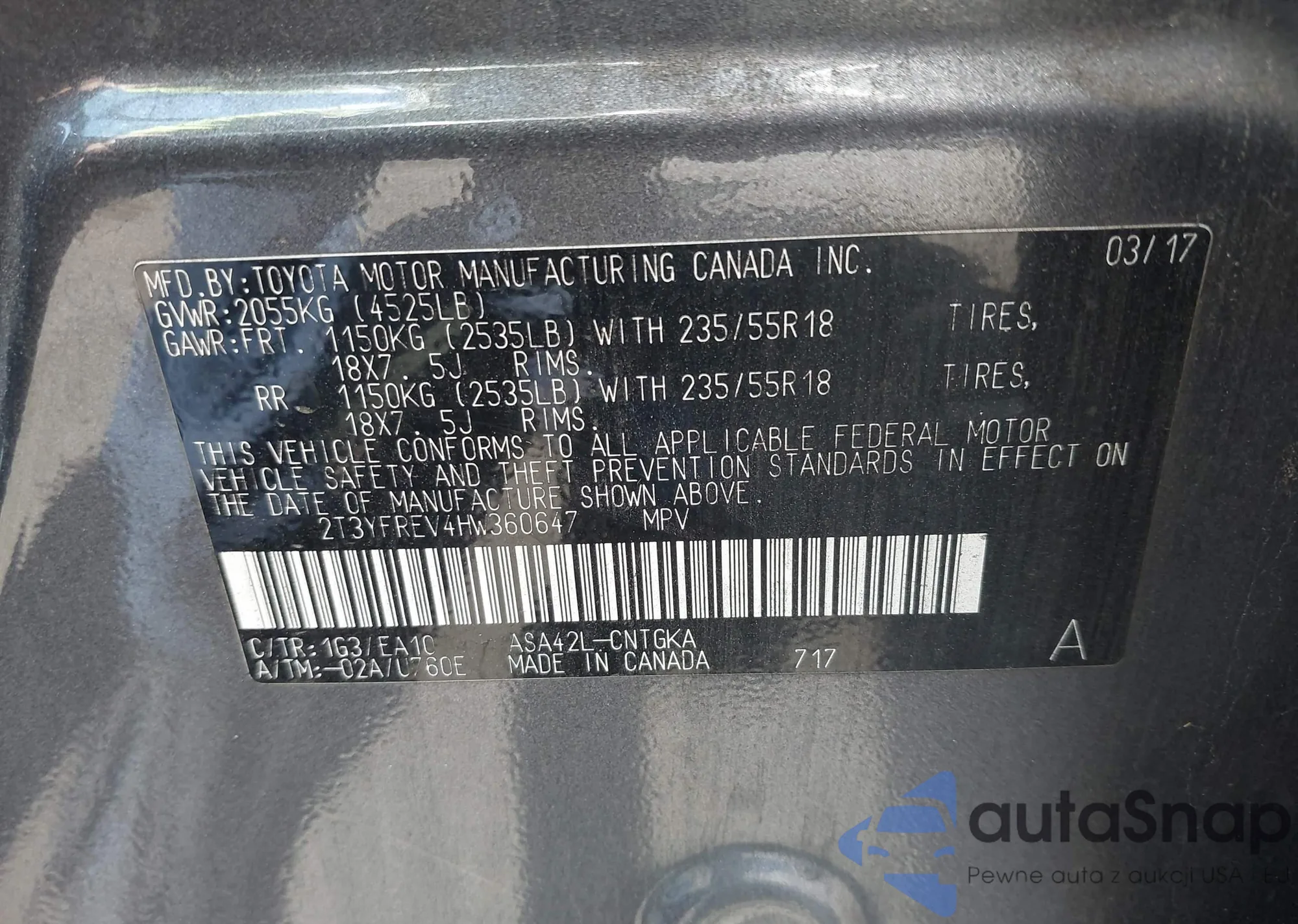 LOT: 42817159 VIN: 2T3YFREV4HW360647