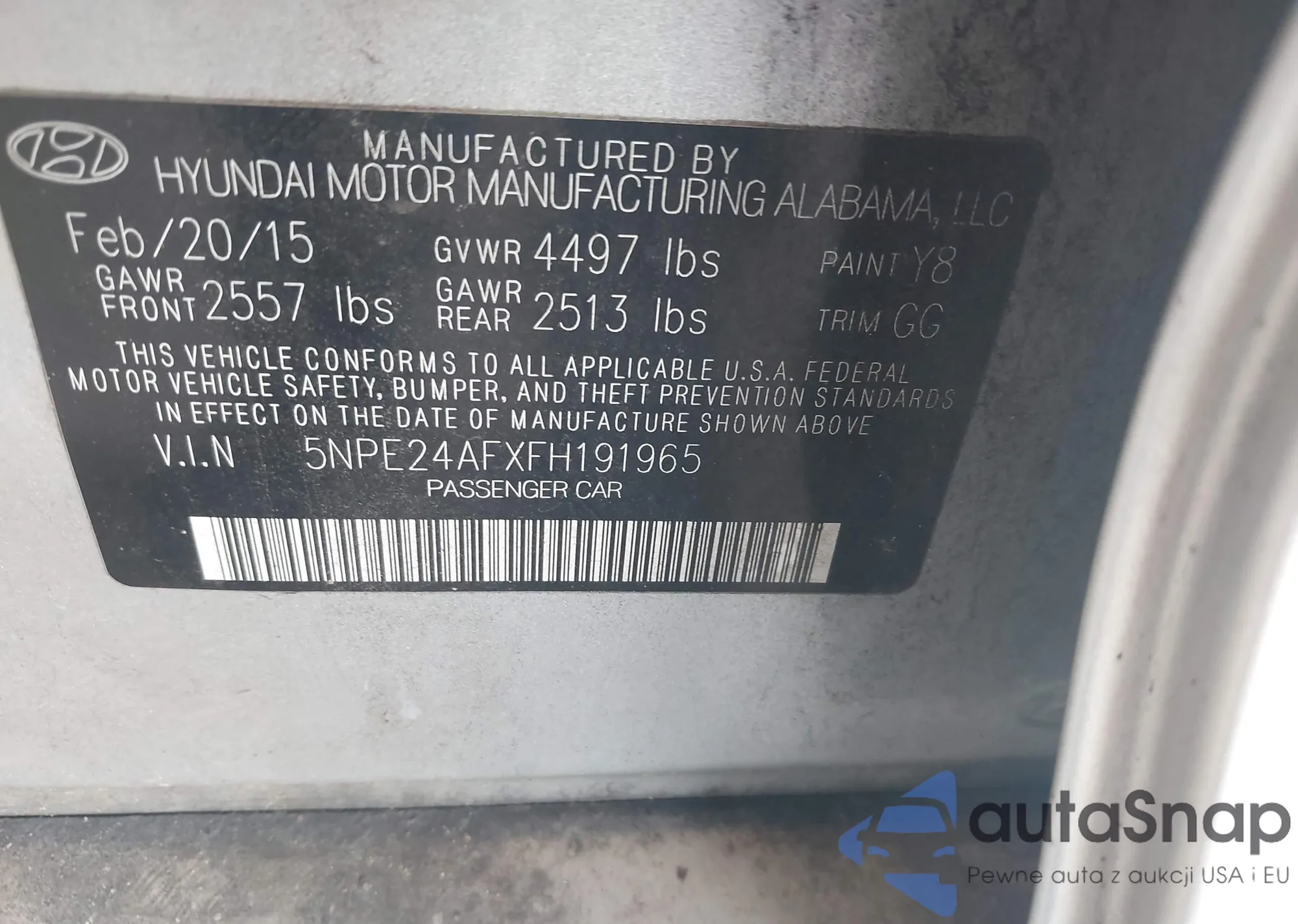 LOT: 42531257 VIN: 5NPE24AFXFH191965