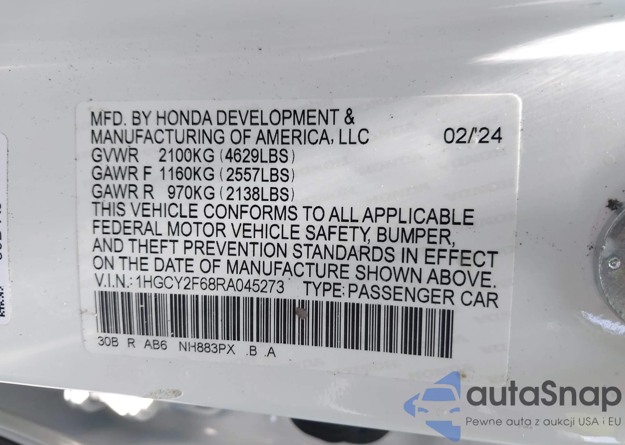 LOT: 42310445 VIN: 1HGCY2F68RA045273