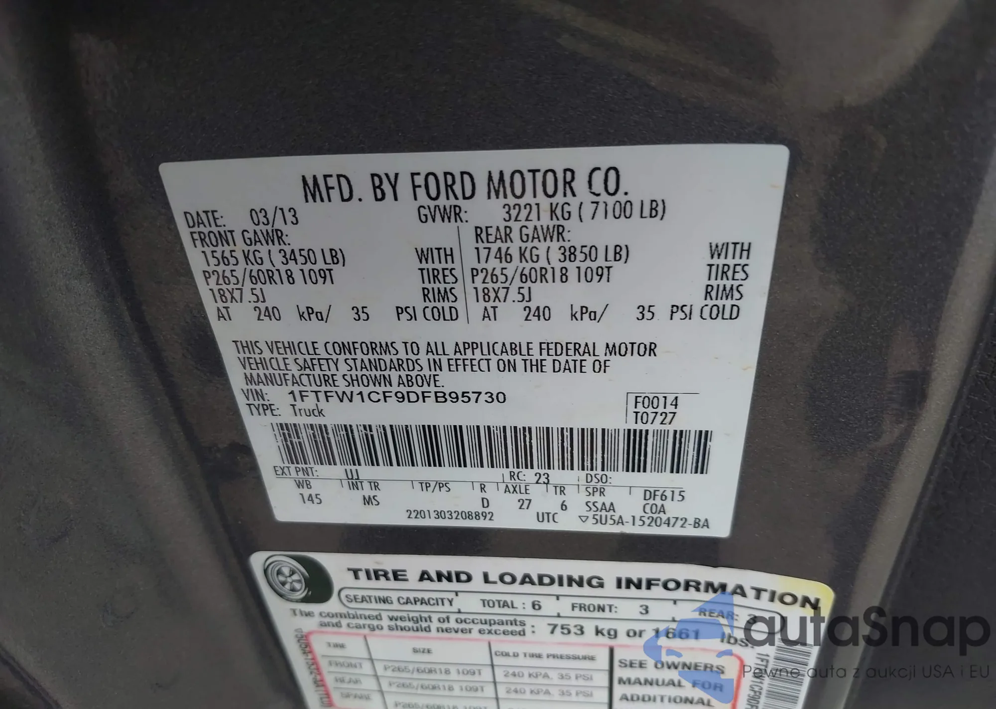 • VIN 1FTFW1CF9DFB95730