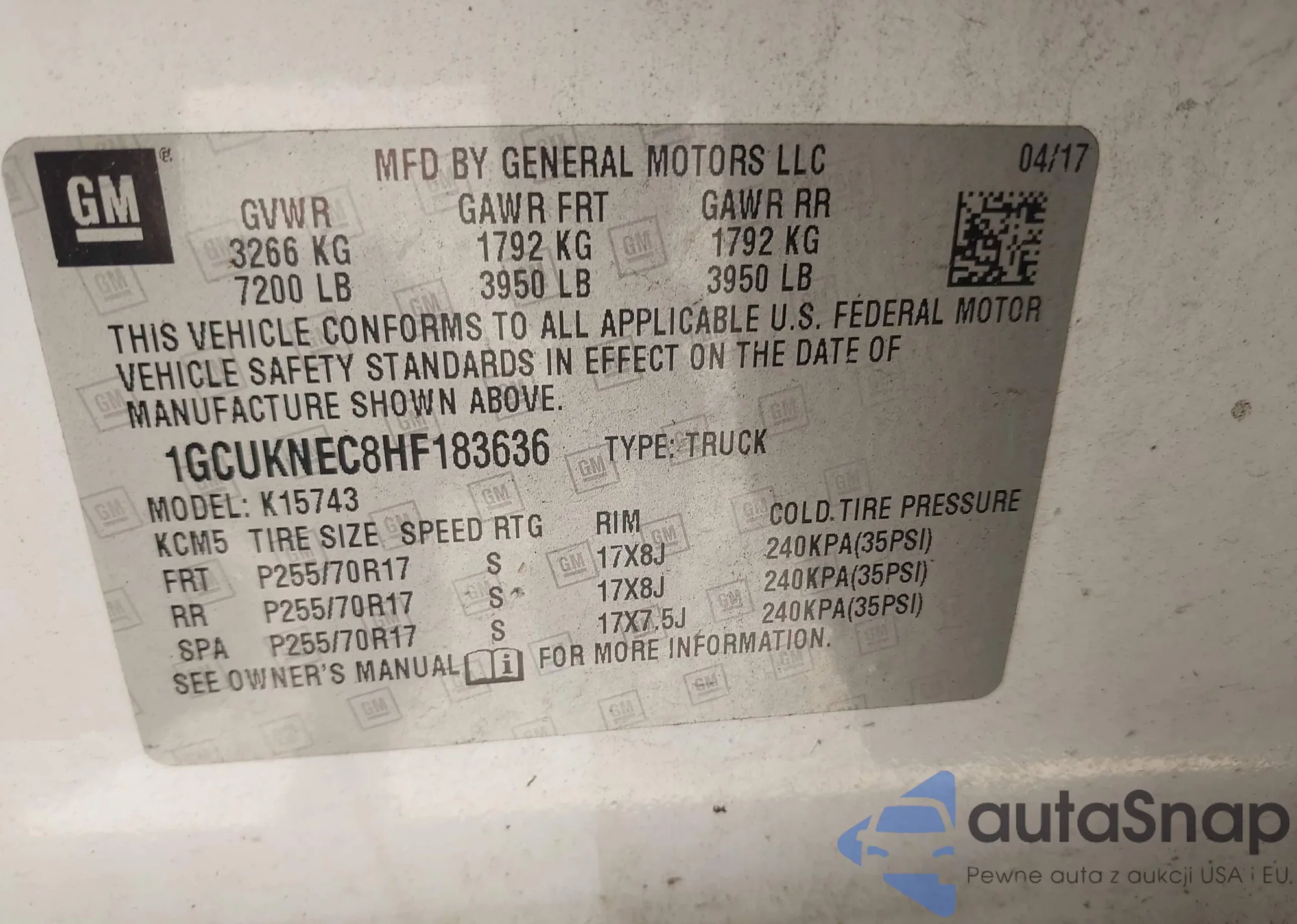 • VIN 1GCUKNEC8HF183636