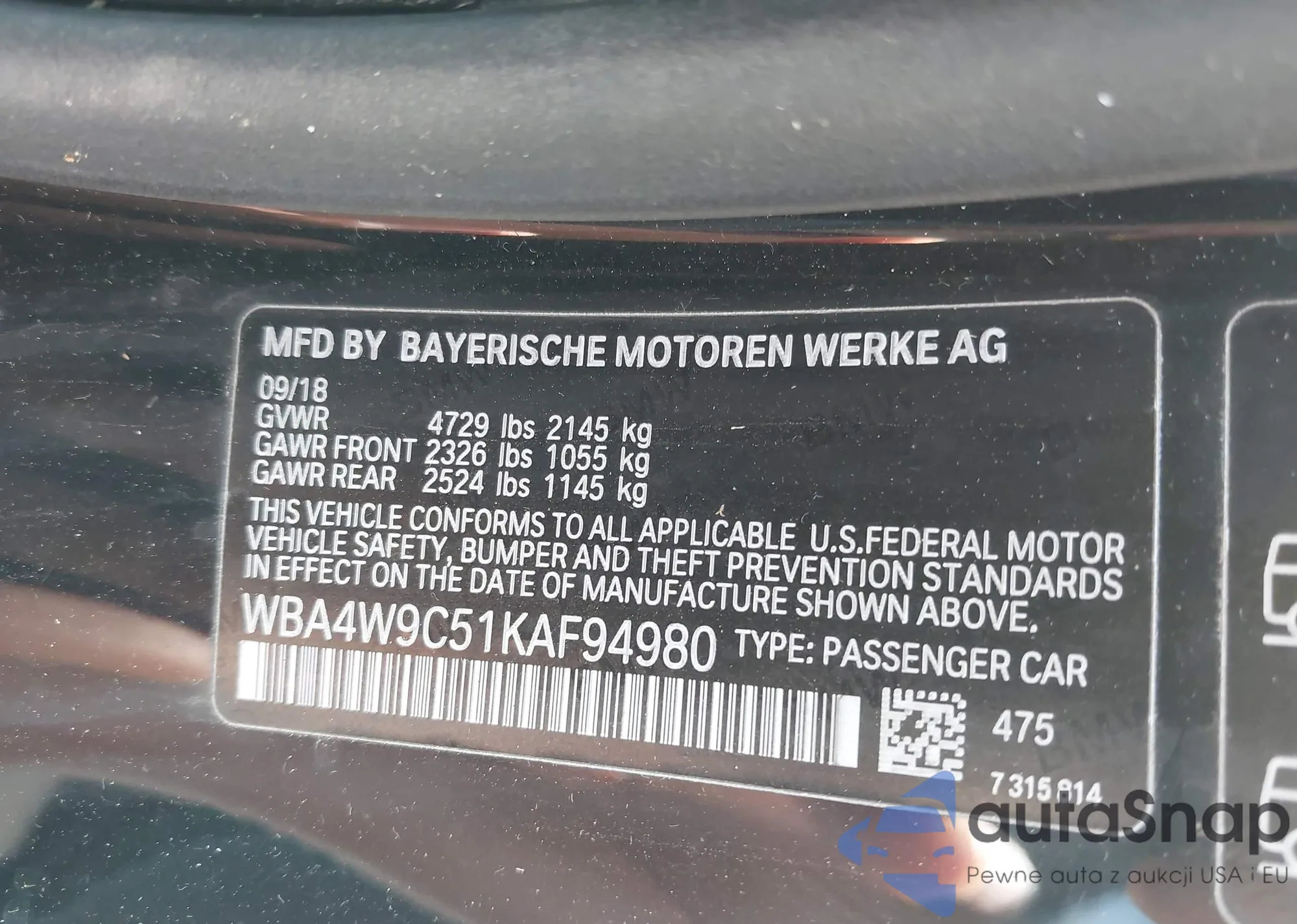 • VIN WBA4W9C51KAF94980