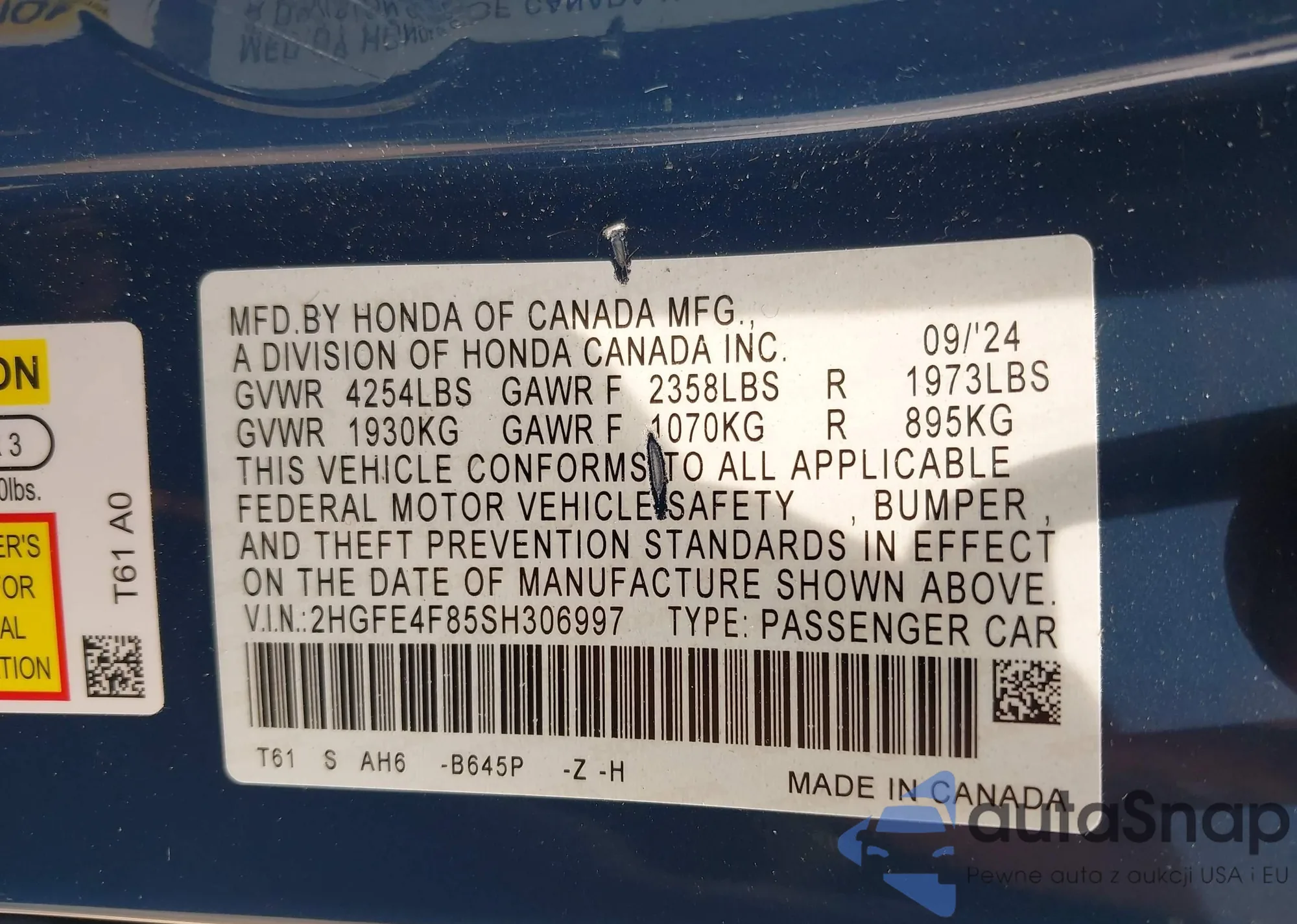 • VIN 2HGFE4F85SH306997