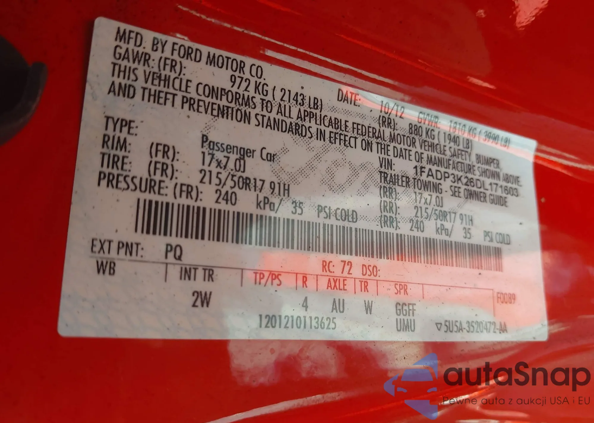 LOT: 42415414 VIN: 1FADP3K26DL171603