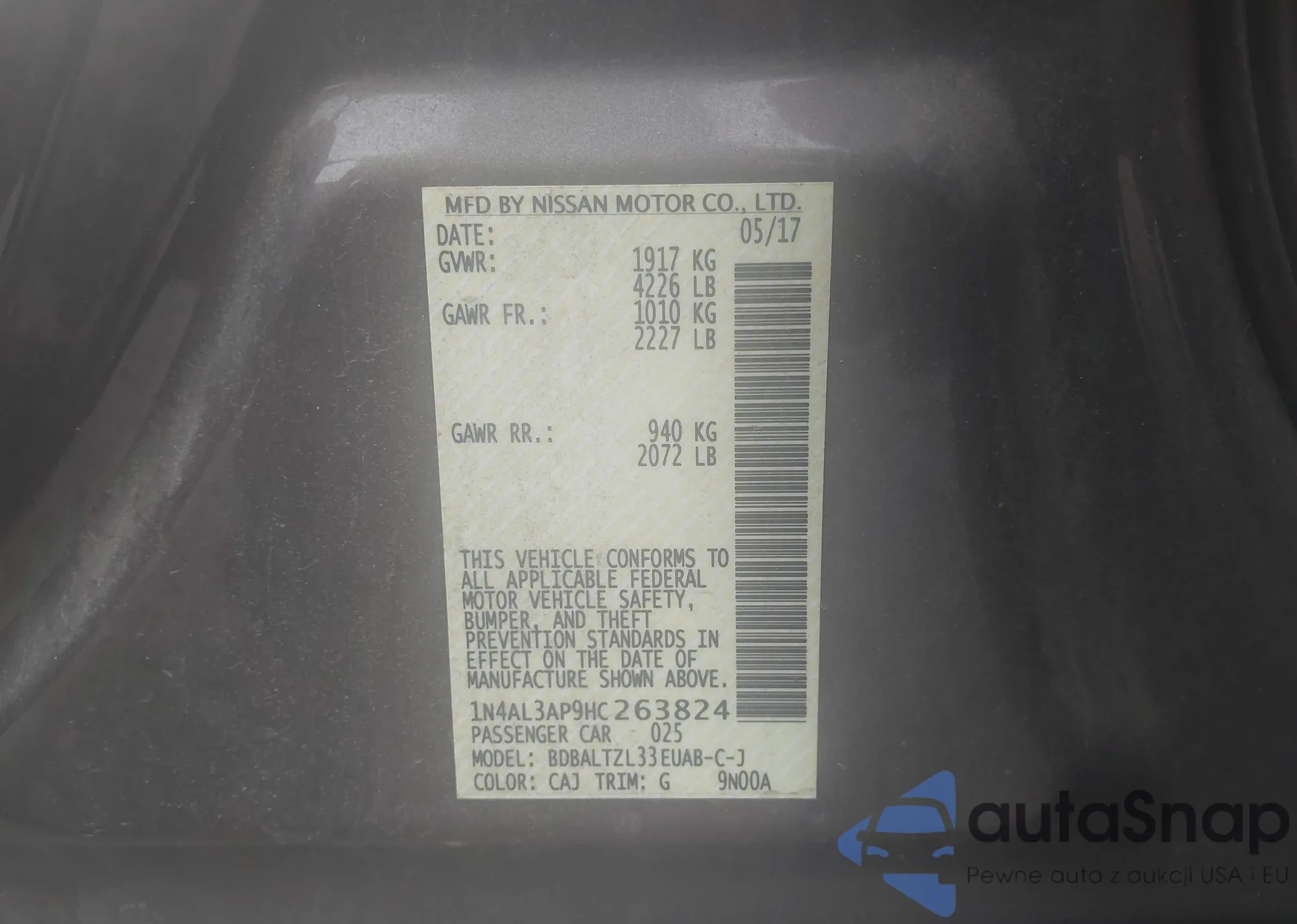 • VIN 1N4AL3AP9HC263824