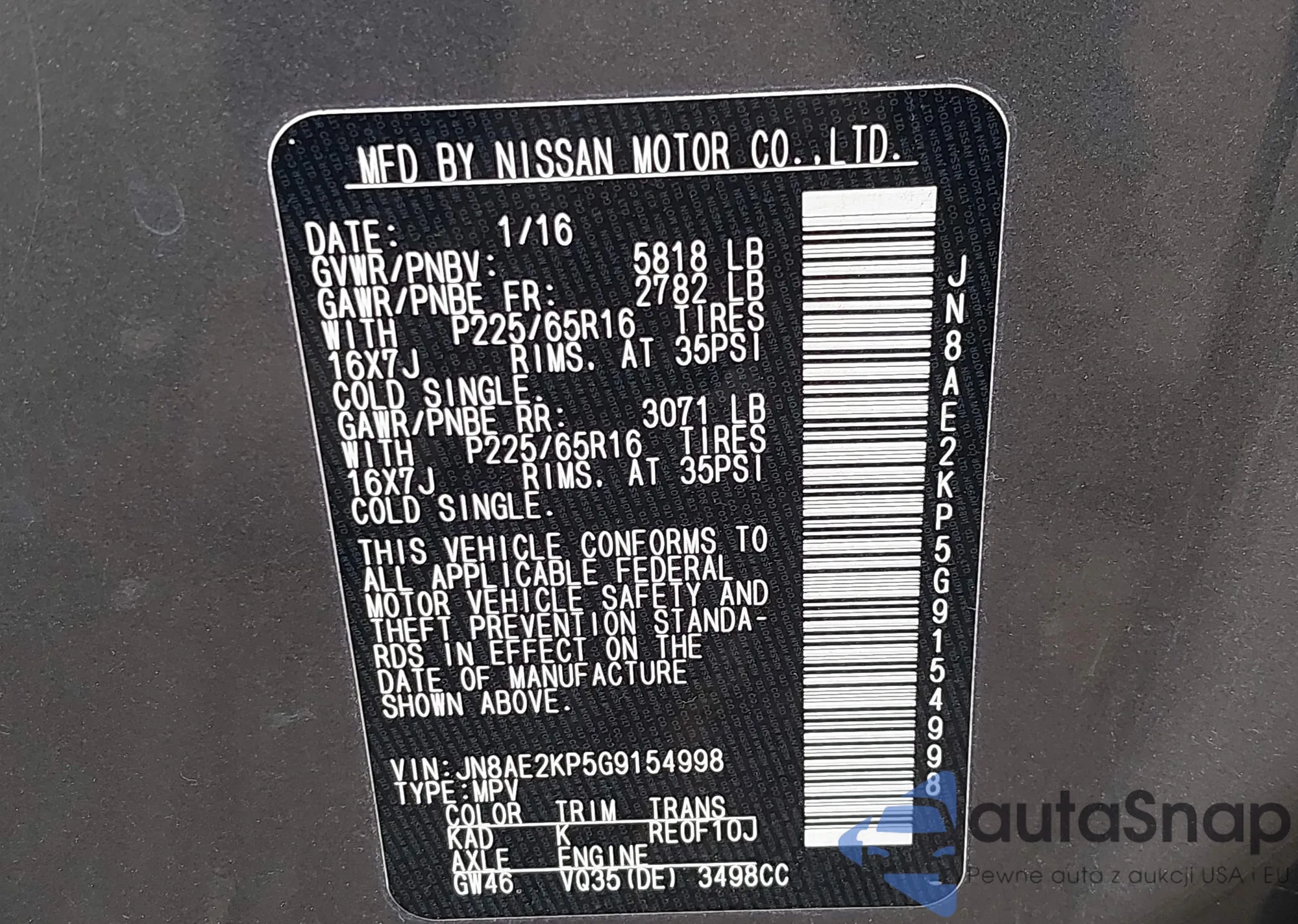 LOT: 42466989 VIN: JN8AE2KP5G9154998