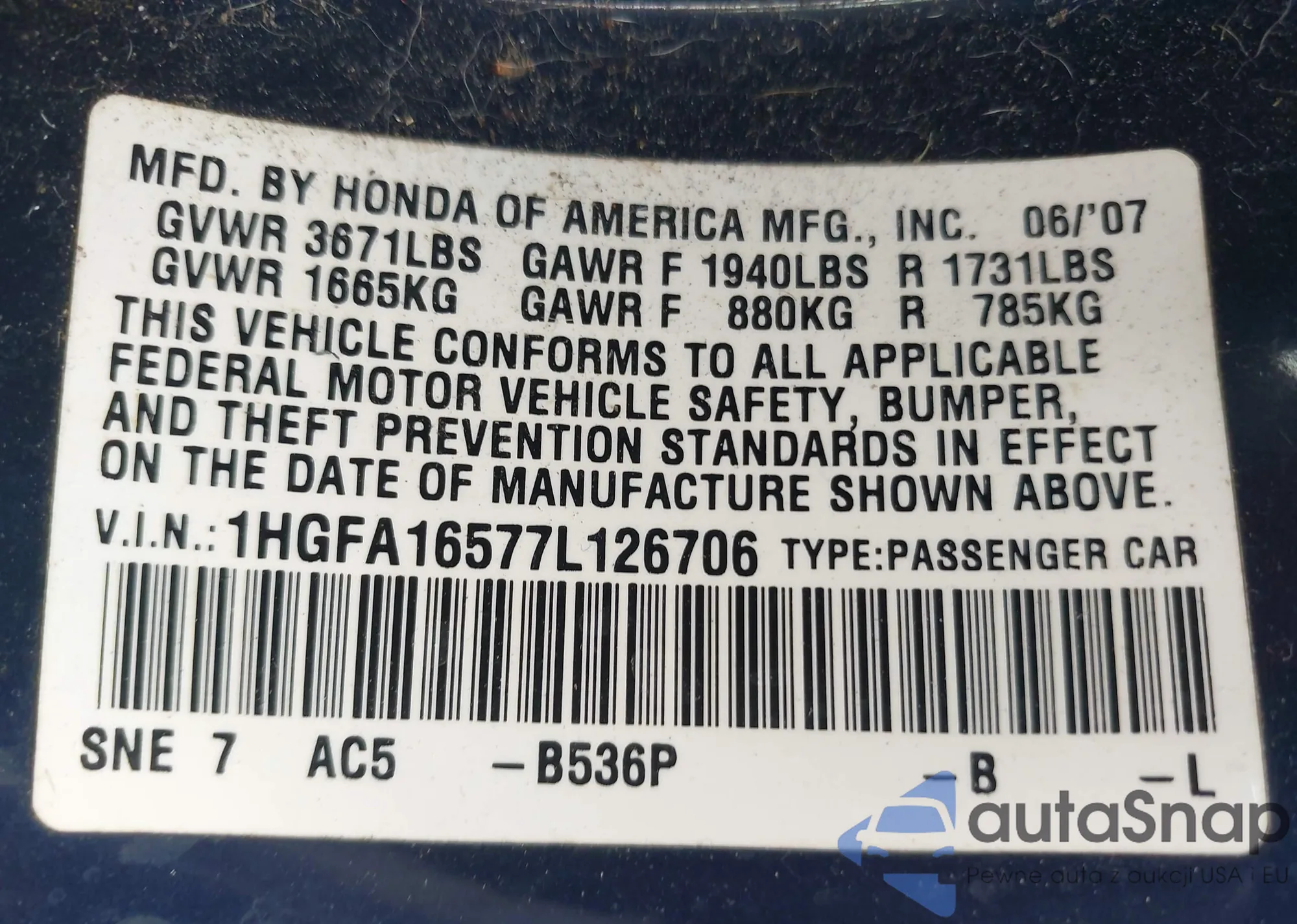 • VIN 1HGFA16577L126706