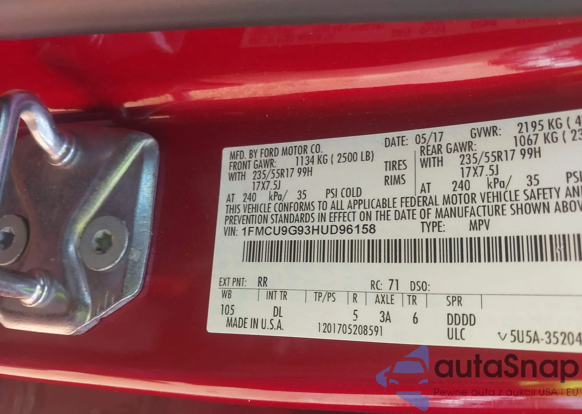 • VIN 1FMCU9G93HUD96158