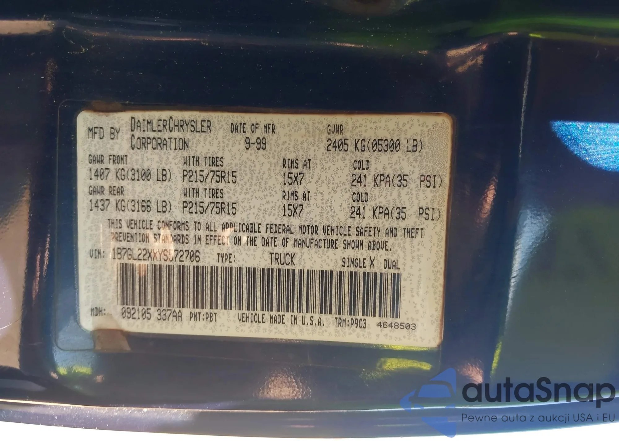 • VIN 1B7GL22XXYS572706
