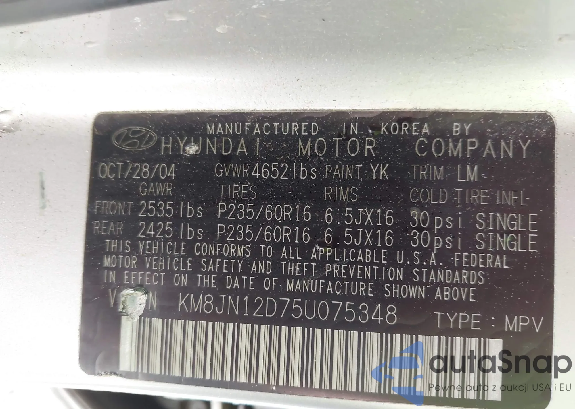 LOT: 42581656 VIN: KM8JN12D75U075348