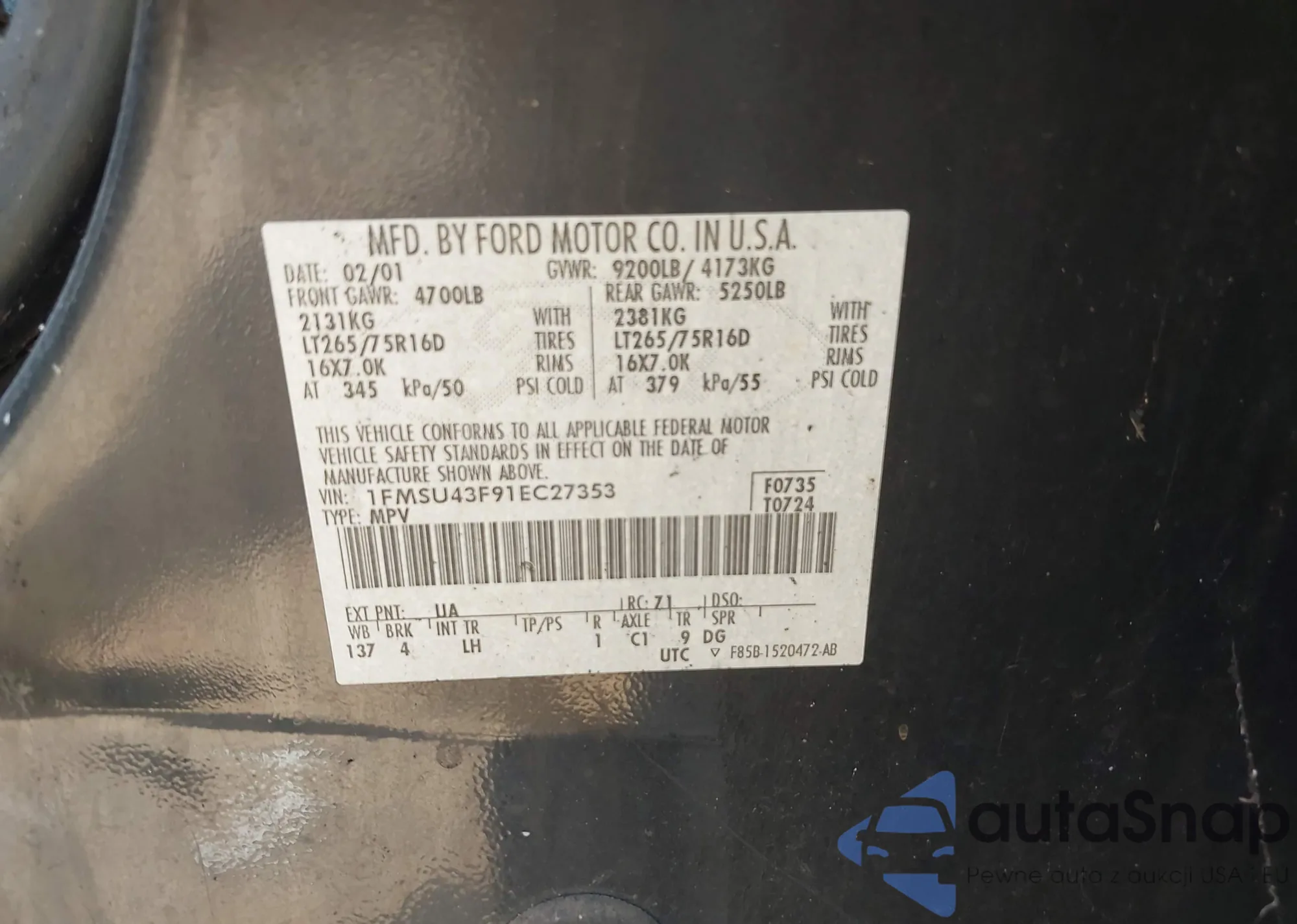LOT: 42602756 VIN: 1FMSU43F91EC27353