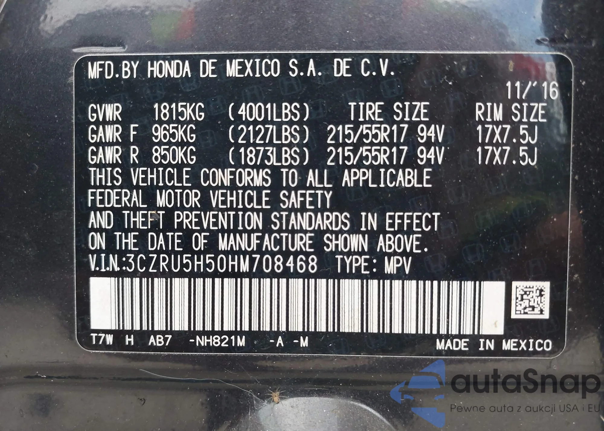 • VIN 3CZRU5H50HM708468
