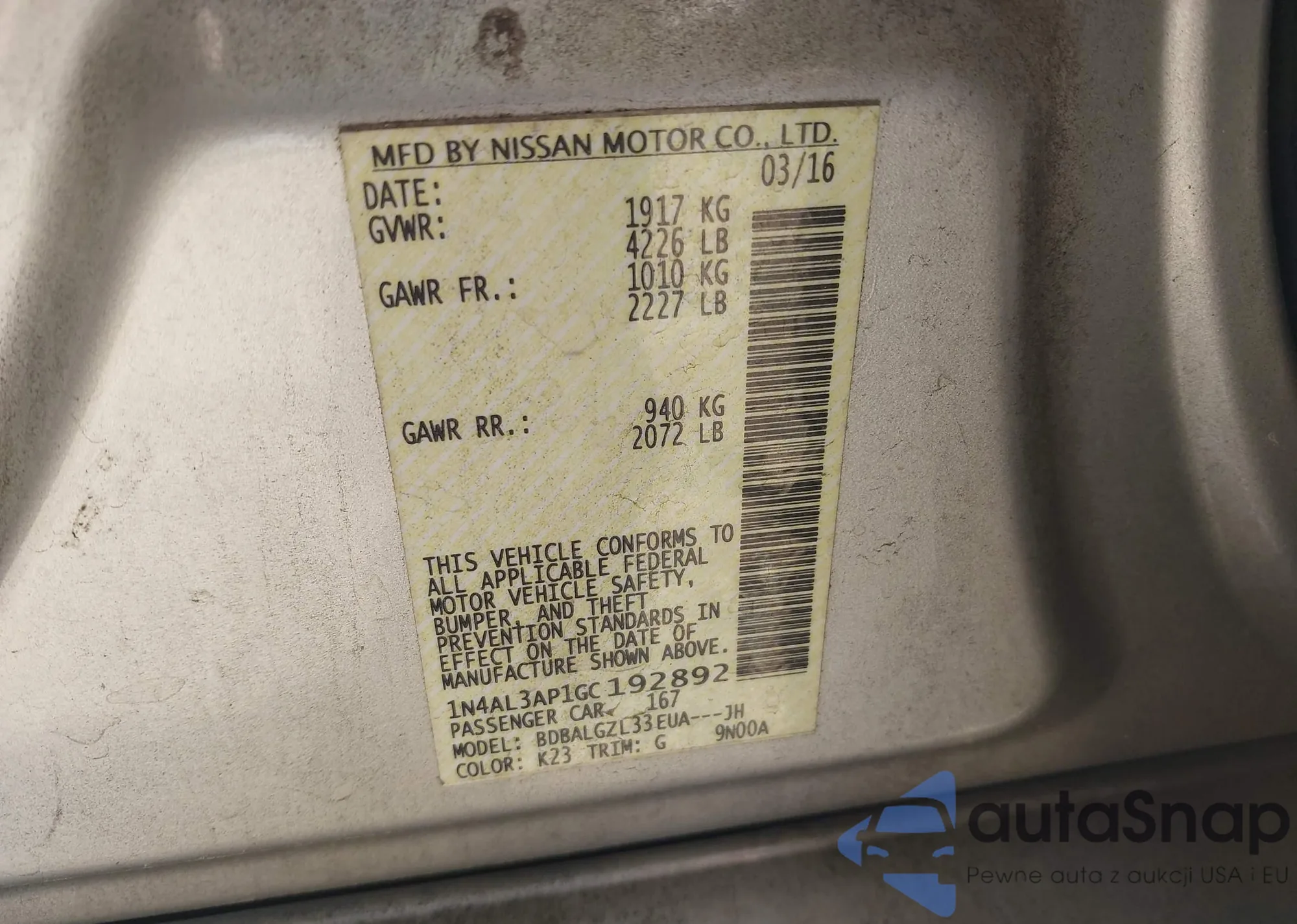 LOT: 42513850 VIN: 1N4AL3AP1GC192892