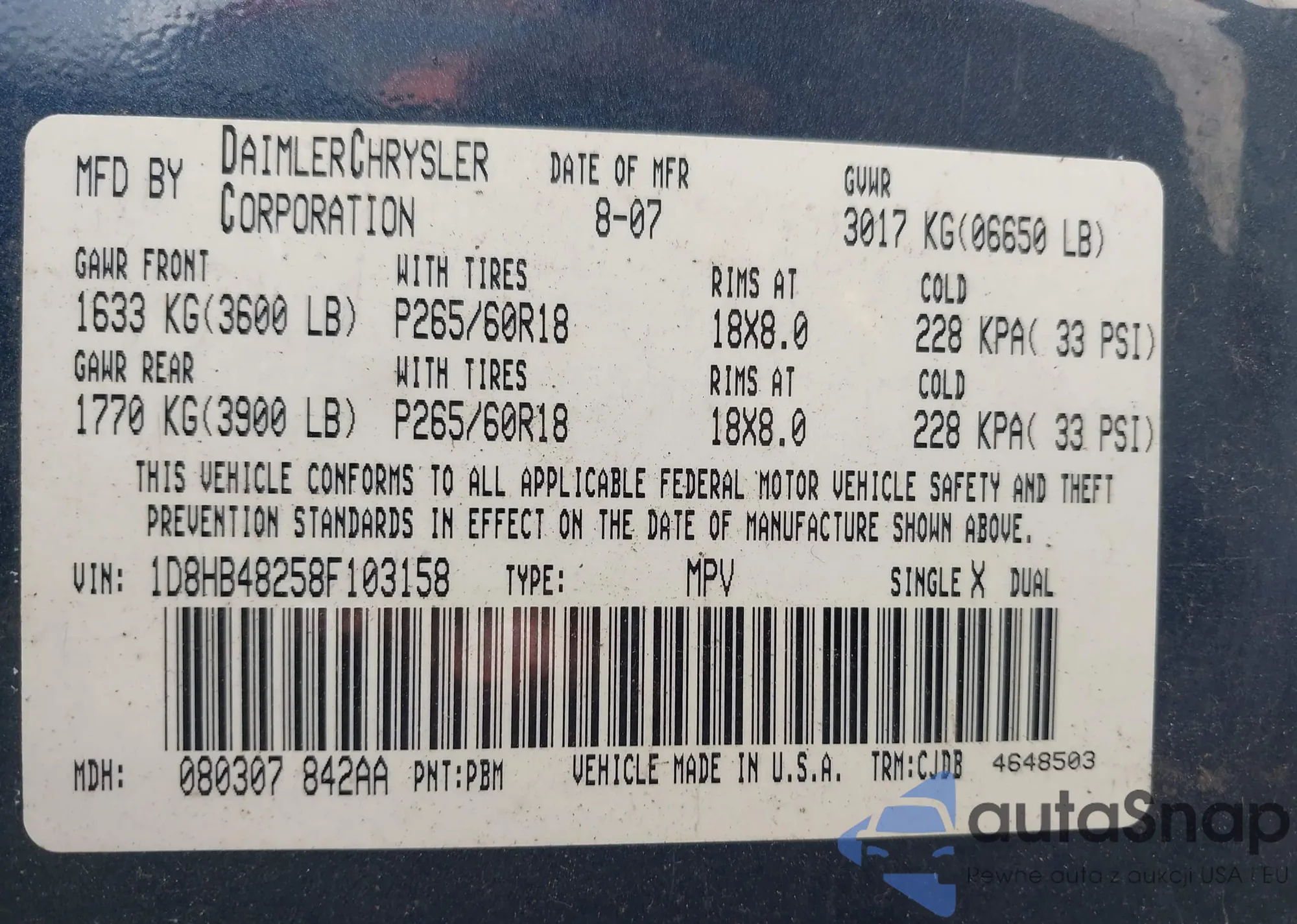 • VIN 1D8HB48258F103158