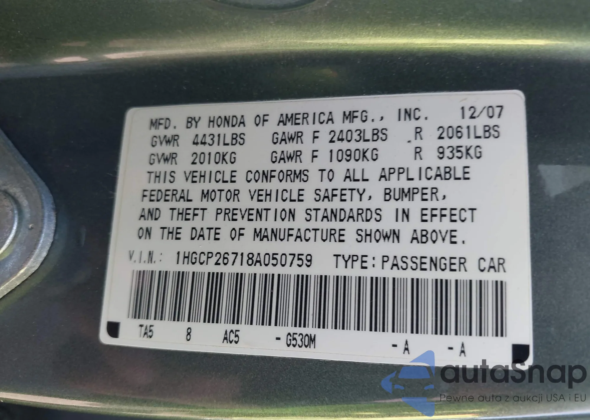 • VIN 1HGCP26718A050759