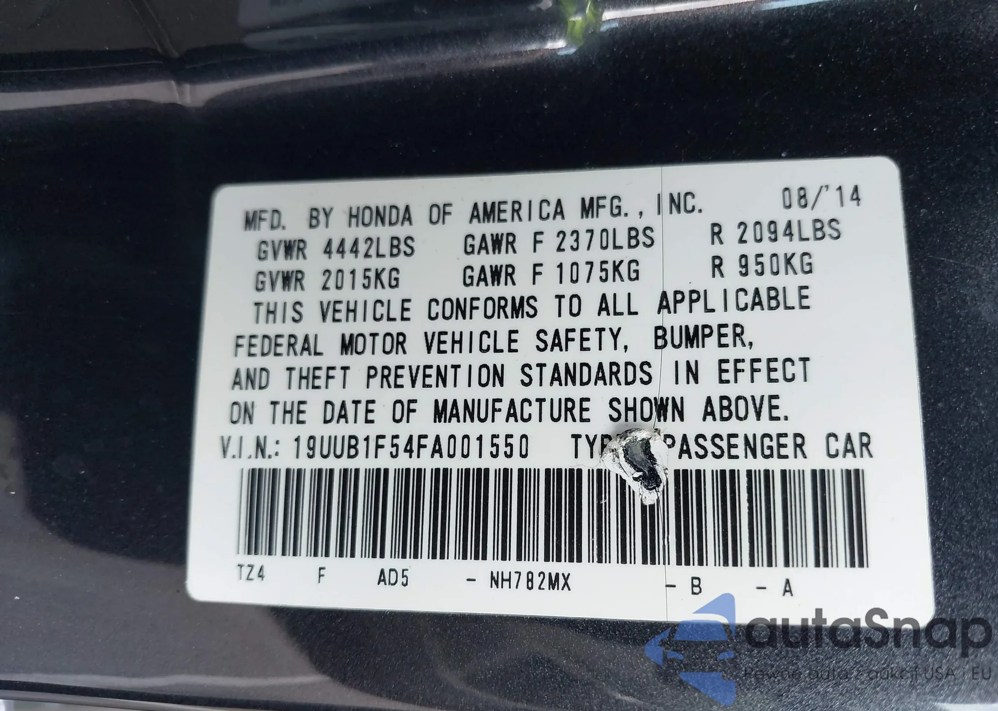 • VIN 19UUB1F54FA001550
