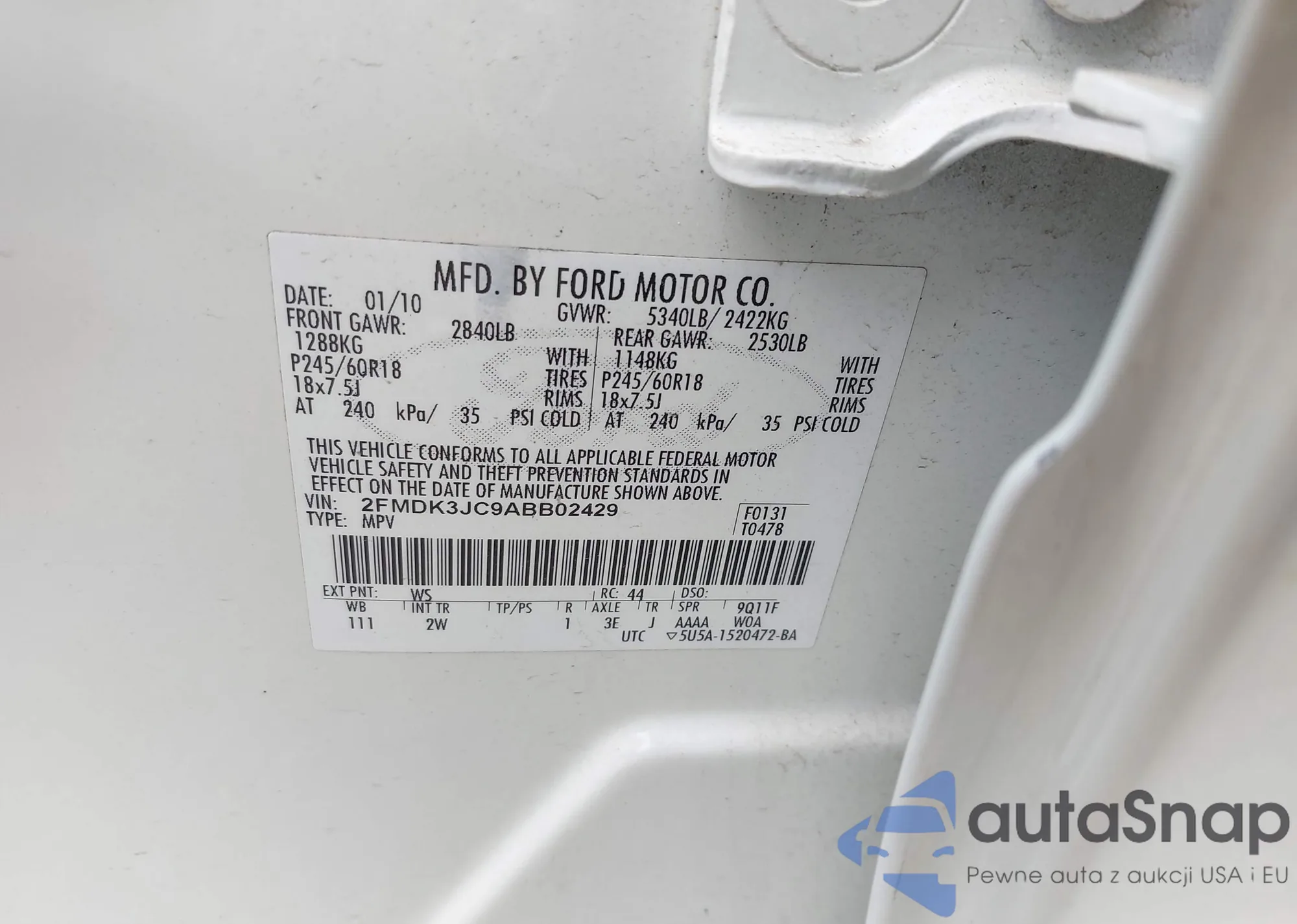 LOT: 42525387 VIN: 2FMDK3JC9ABB02429