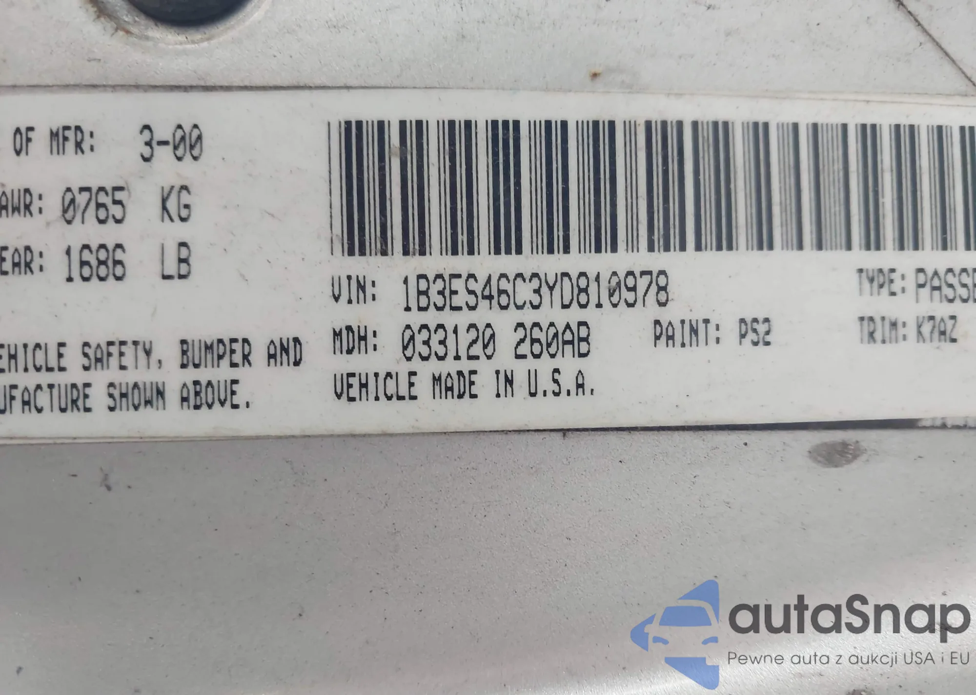 • VIN 1B3ES46C3YD810978