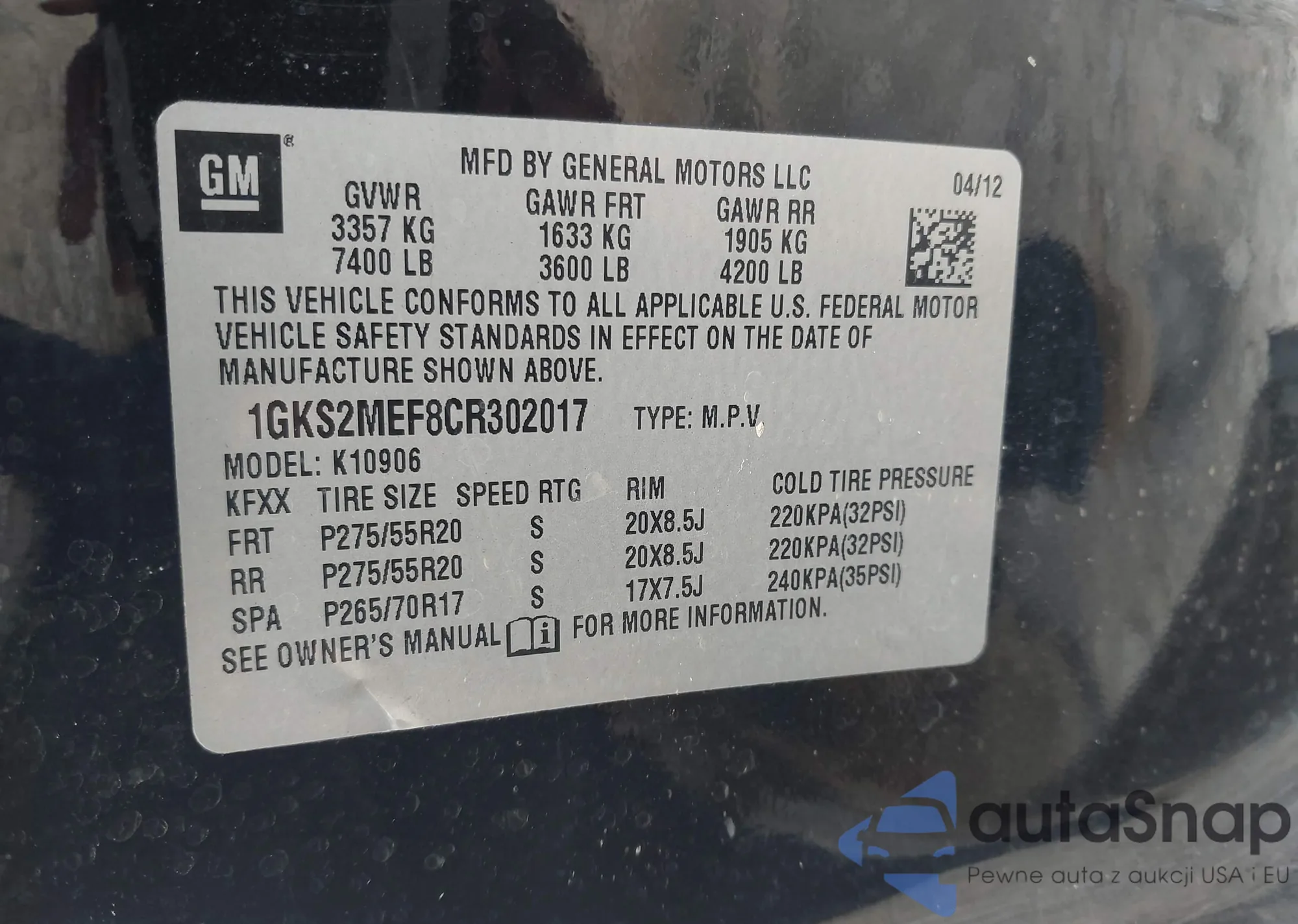 LOT: 42606507 VIN: 1GKS2MEF8CR302017