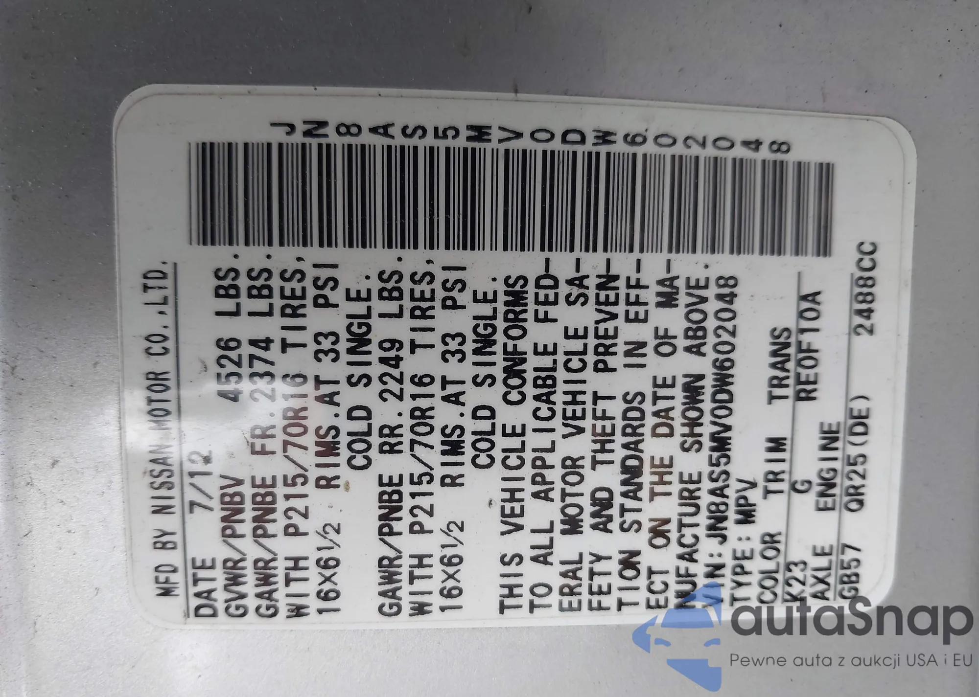• VIN JN8AS5MV0DW602048