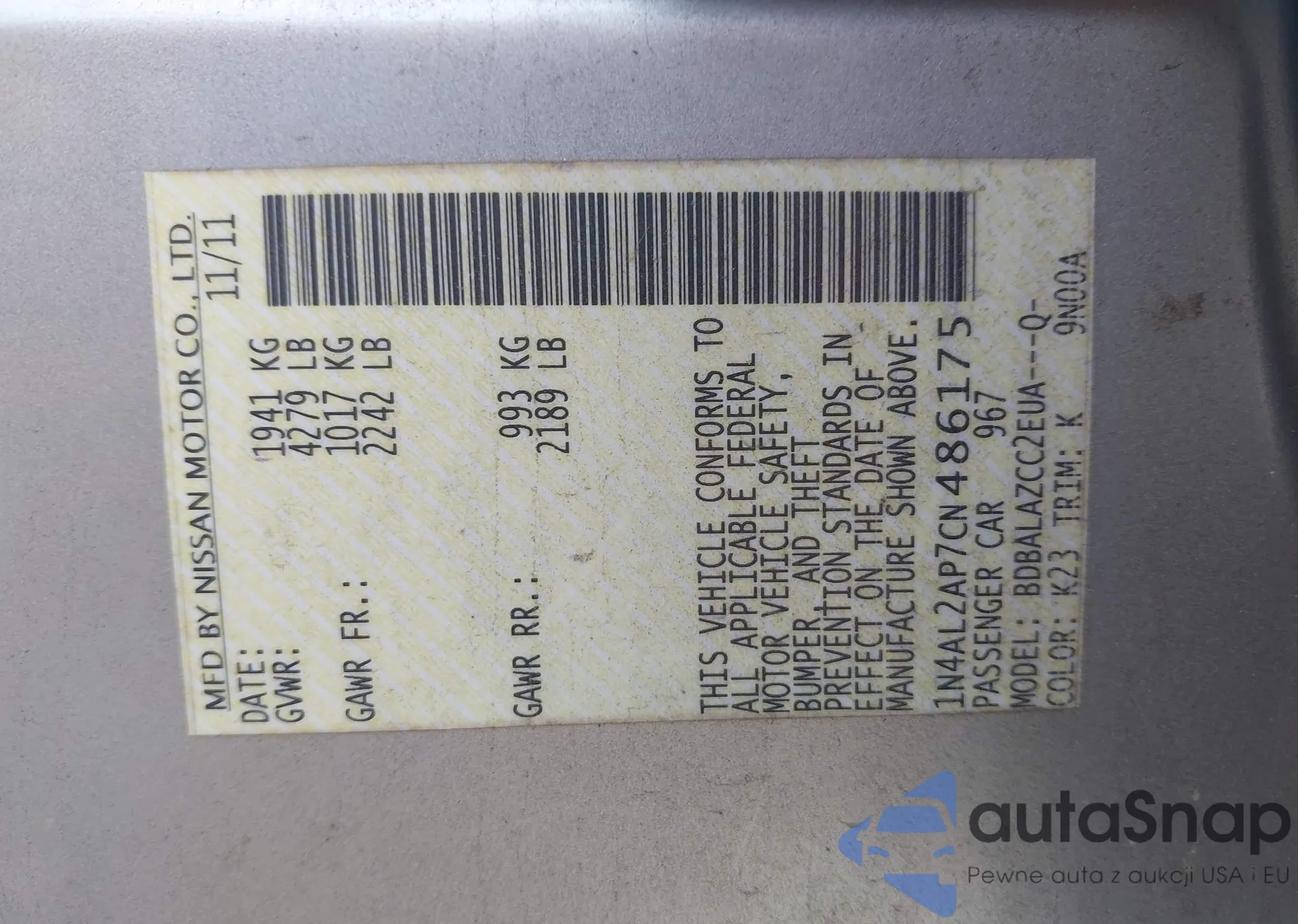• VIN 1N4AL2AP7CN486175