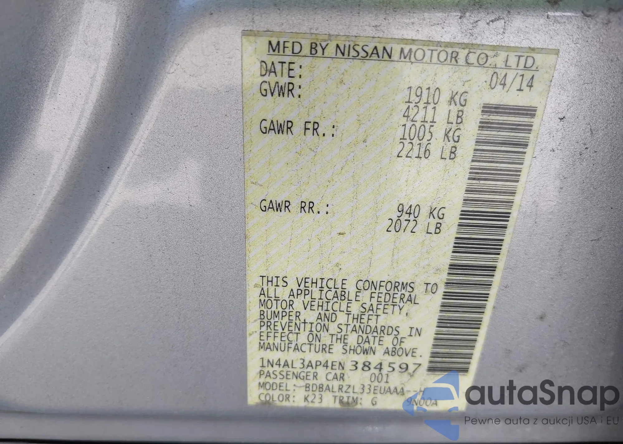 LOT: 42615865 VIN: 1N4AL3AP4EN384597