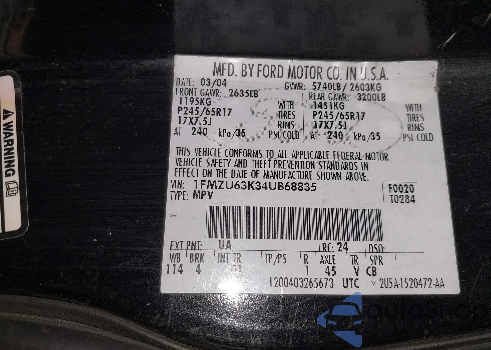 • VIN 1FMZU63K34UB68835