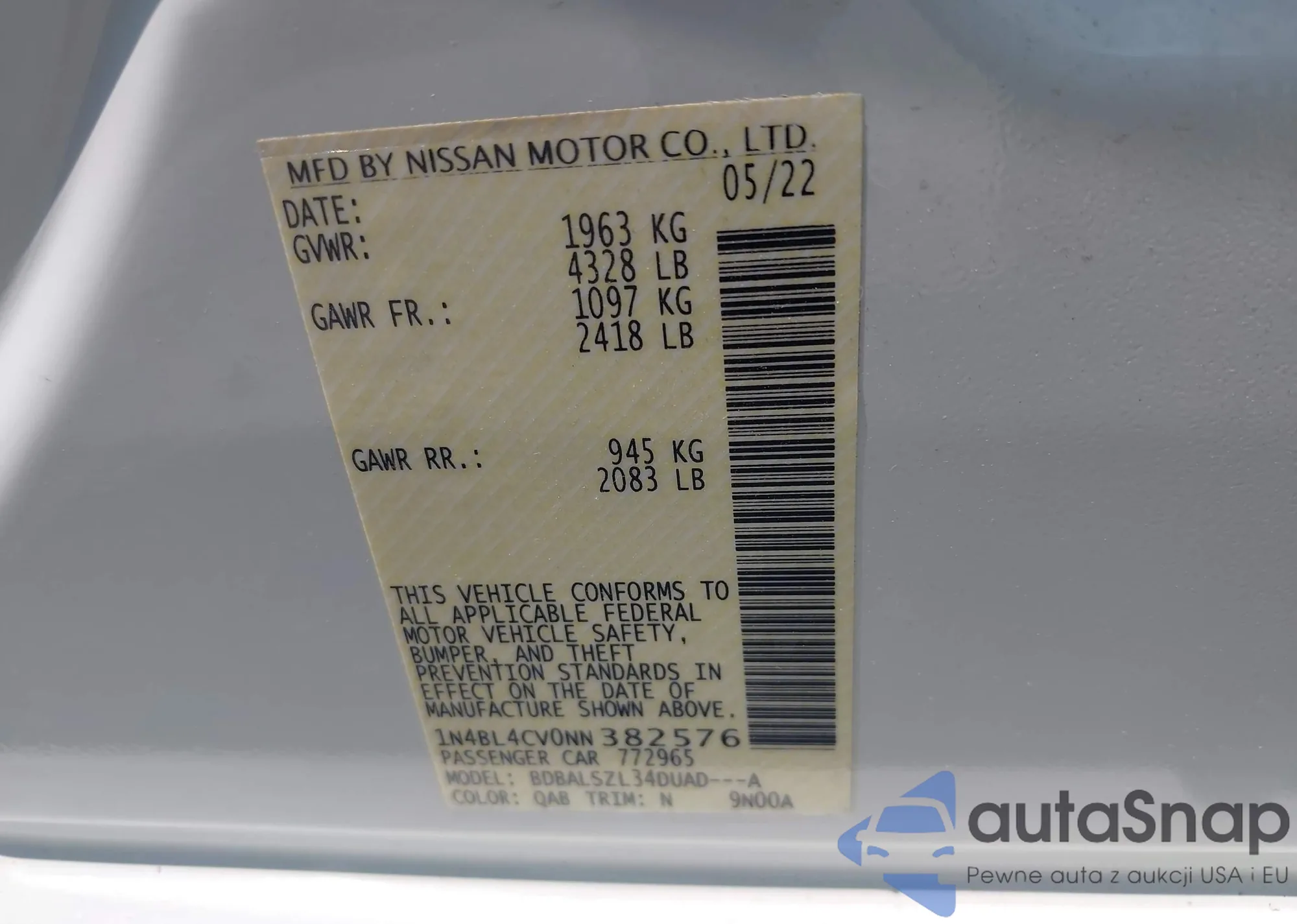 LOT: 42419426 VIN: 1N4BL4CV0NN382576