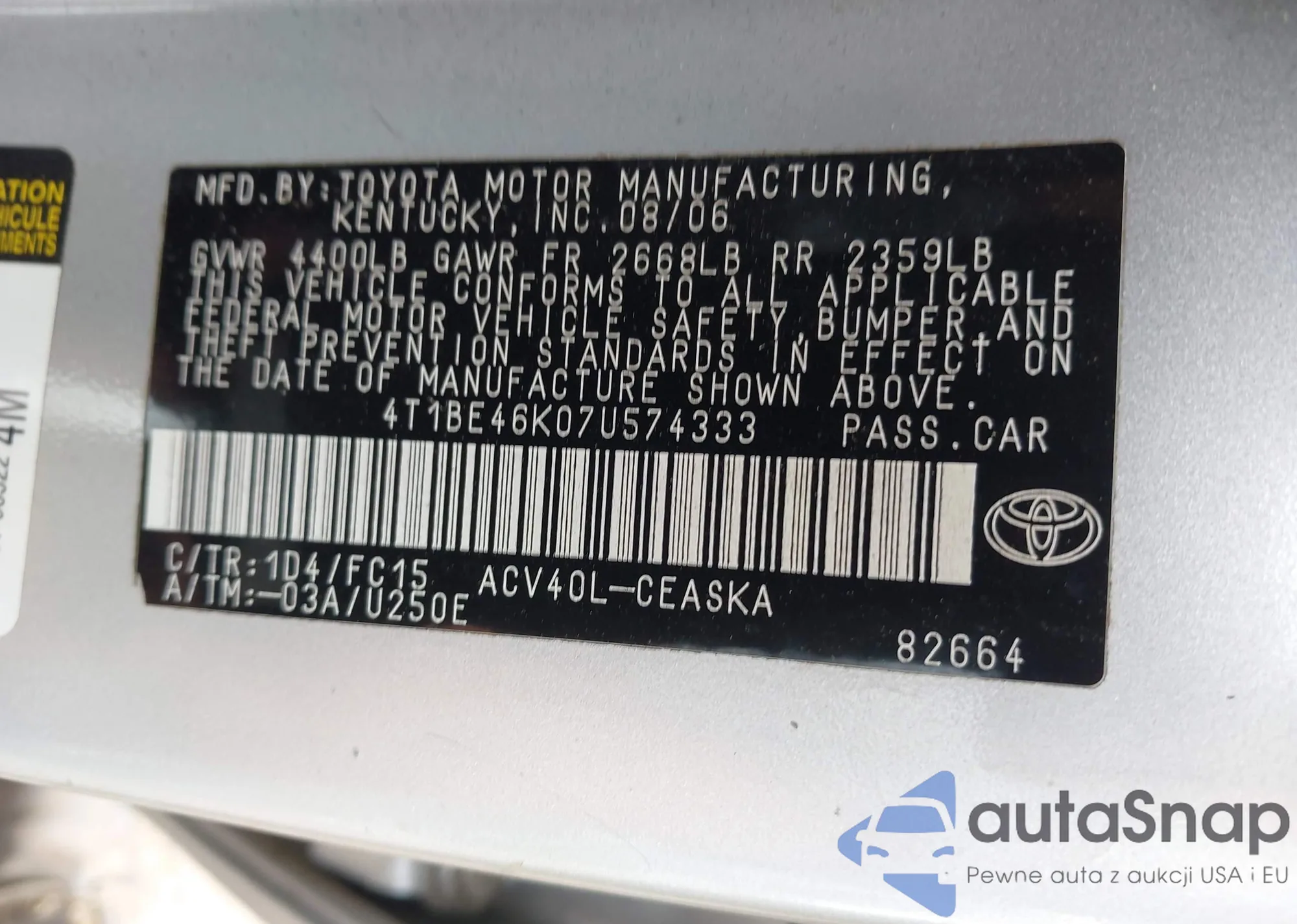 • VIN 4T1BE46K07U574333