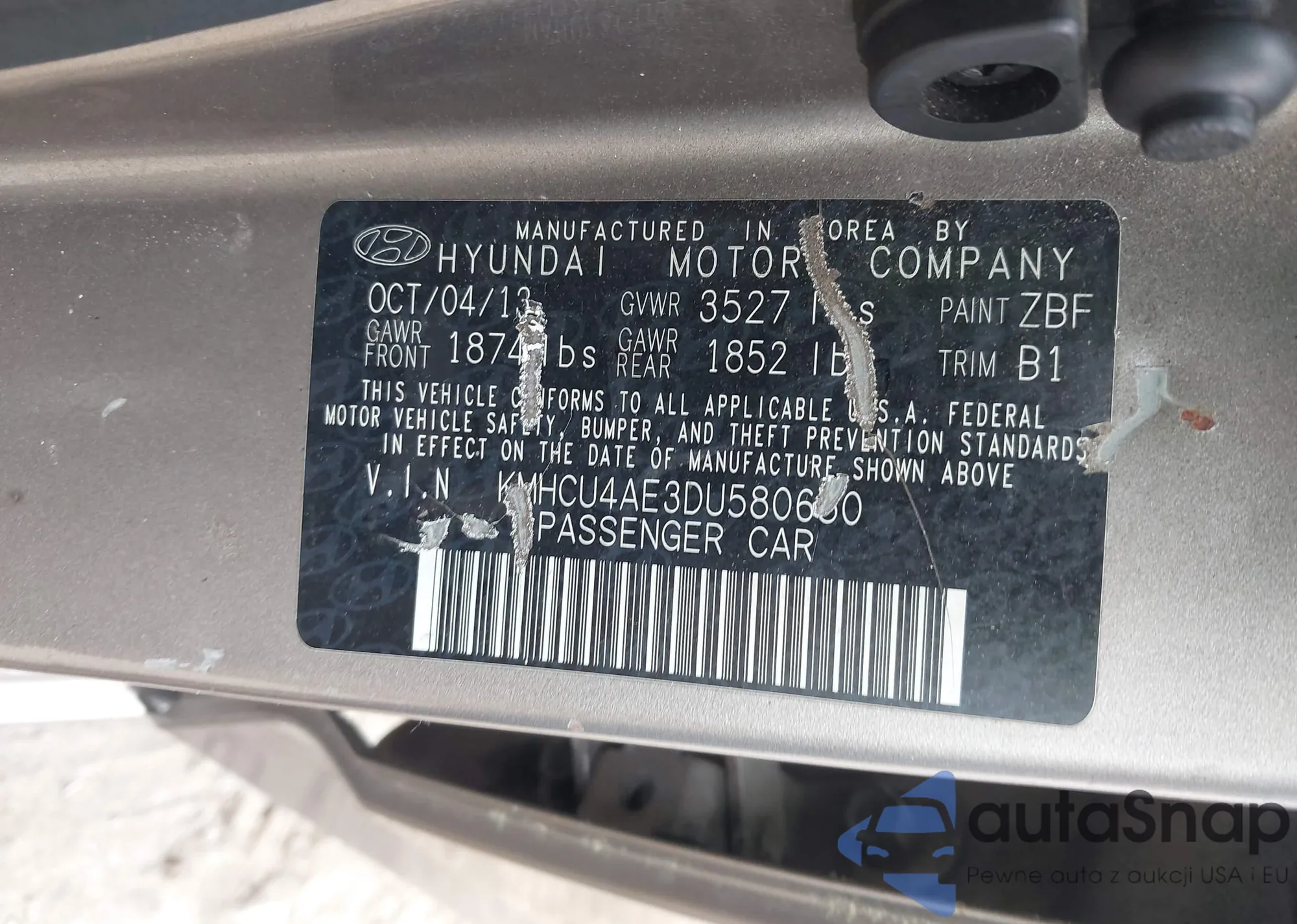 LOT: 42479723 VIN: KMHCU4AE3DU580650
