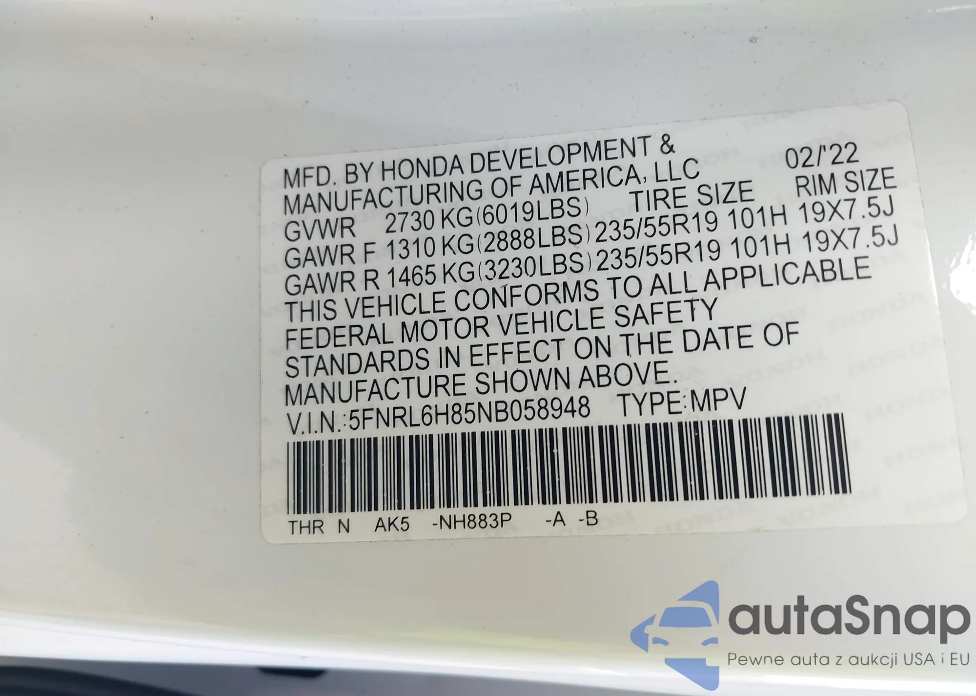 LOT: 42579157 VIN: 5FNRL6H85NB058948
